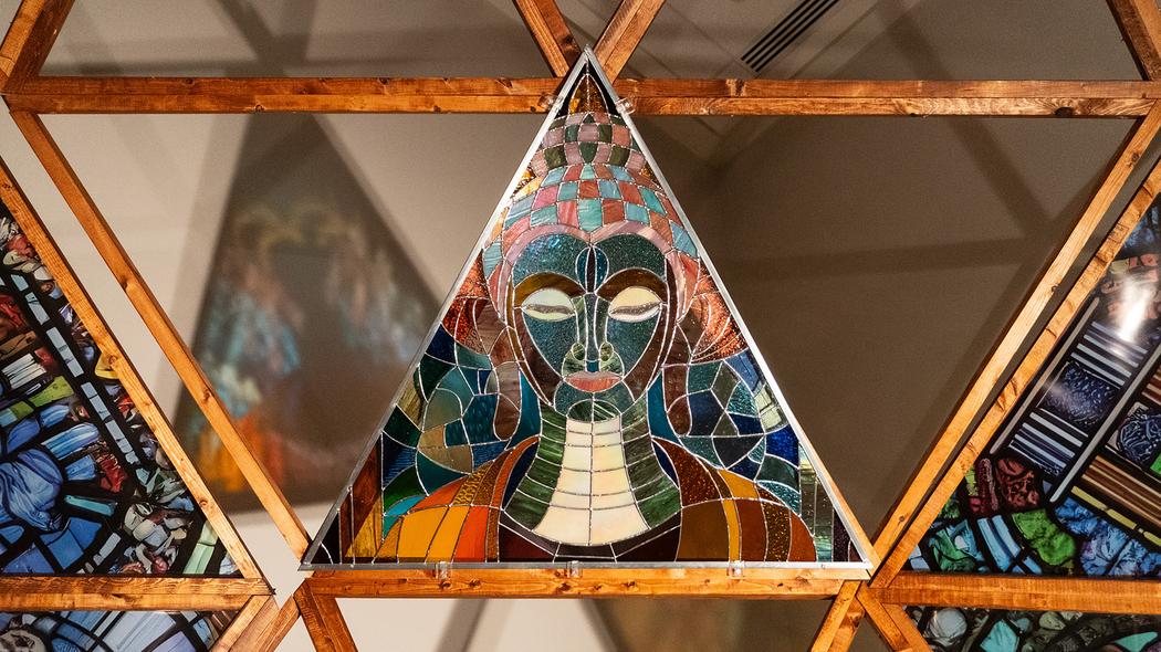 The stained-glass-like pieces evoke both mythological figures and futuristic beings. What role do mythology and technology play in shaping your imagery?