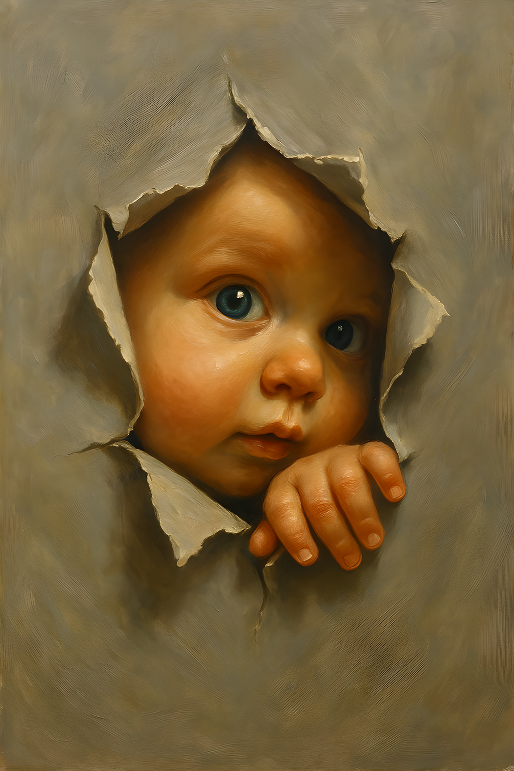 The image of a child peering through paper feels symbolic of perception and discovery. Is this a recurring theme in your work—the act of seeing or awakening?