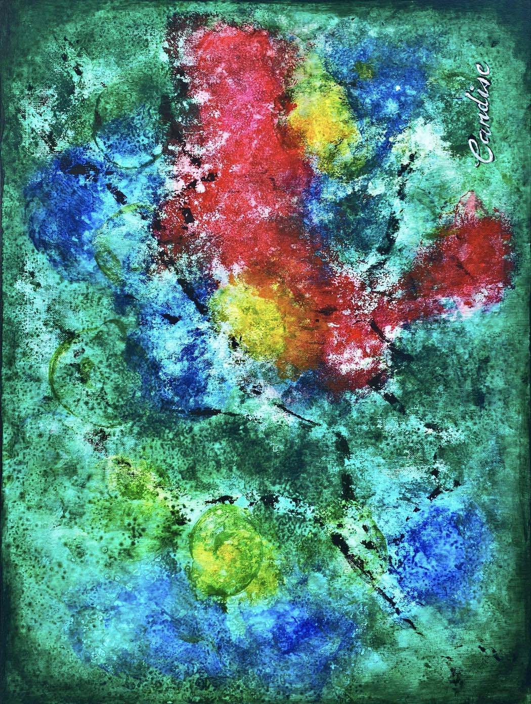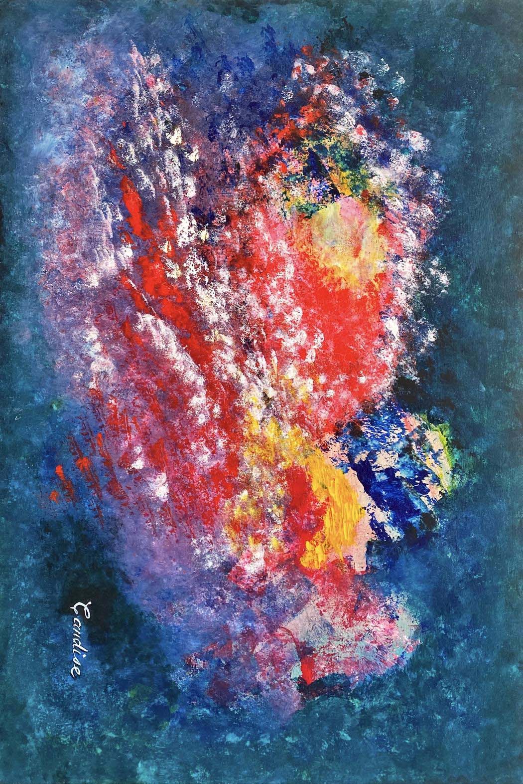 When I begin a piece, it usually starts with an emotional or spiritual state of mind.  Certain colour themes emerge instinctively into my mind, each signalling the feeling I want to express. I’ve experienced moments of light and darkness, calm and tension, and these experiences naturally guide my palette – vibrant yellows for joy, deep blues for introspection, and a mixture of colours for the interaction of my colour choices.