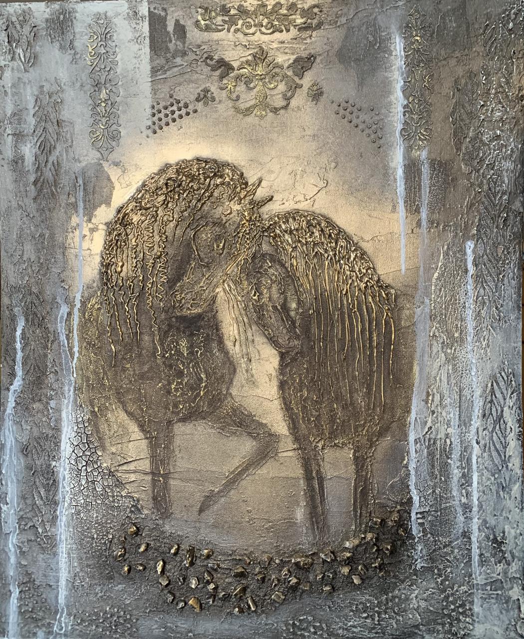While depicting nature, I felt a desire to bring back the tactile sensation of natural materials and move away from the modern glossy plastic aesthetic. I began to experiment—adding sand, stones, bark, and fabric to my pastes. The painting becomes not just an image of nature, but something more. You want to reach out and touch it, remembering the roughness of stones, the ruggedness of bark, the delicacy of petals, the silky feel of a mane.