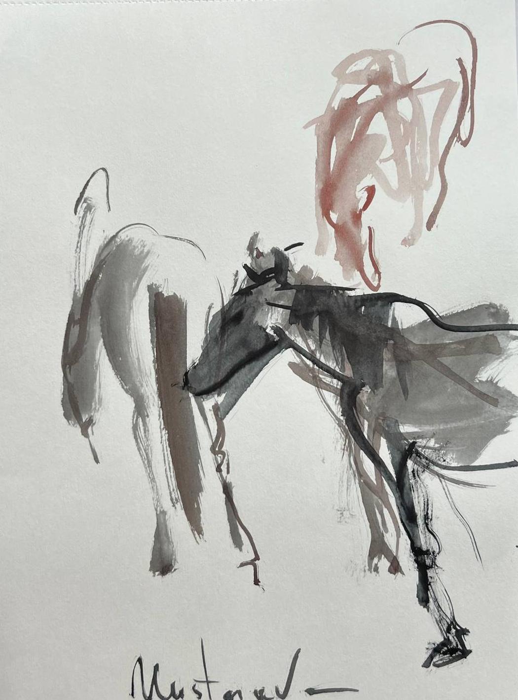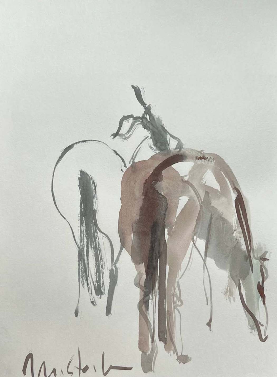 Lately, I prefer working in smaller formats, creating graphic compositions. On a small sheet of paper, it’s much harder to convey the full depth of emotion and energy. I usually work on heavy watercolor paper and work quickly, trying to immediately translate my vision and emotions onto the page. My palette includes black gouache, a fineliner, and watercolor. The impulse for a piece can come from anything: even a crow seen on a walk or a horse painted en plein air can become the basis for finished graphic scenes.