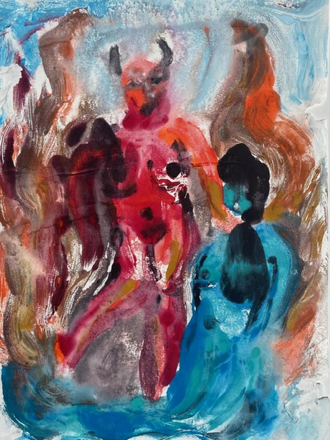 Your paintings combine vibrant color palettes with iconographic and spiritual motifs. How do you choose the symbols and colors for each piece?
