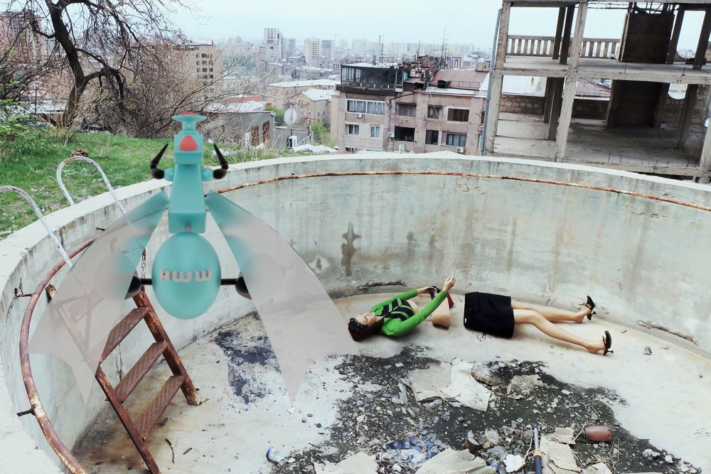 The collaboration with 3D artist ashoka3dd extends the project beyond static documentation into speculative world-building. The inclusion of a hovering digital drone—playful, almost naïve in form—reinforces the disconnect between technological optimism and lived reality. It observes but does not intervene, functioning like a witness or archivist of failure. Its pastel palette contrasts sharply with the desaturated environment, highlighting the broken promise of a bright, frictionless future.