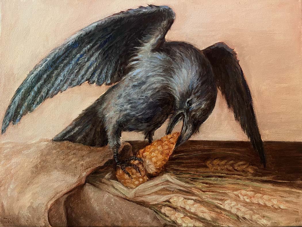 Almost with every piece. At different stages in my art I always hesitate, wanting to stop and hold onto the current feeling but I often have to force myself forward to completion. Ravenous reminded me that intention isn’t fixed; whether cognitively or not while painting I was symbolizing my relationship with the raven, at the time I thought I was being thoughtful and honest, now even I can see the hints I left for myself in the piece.
