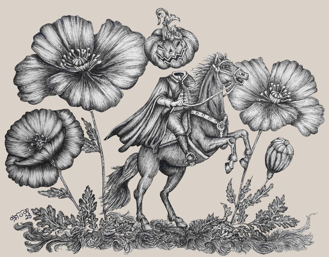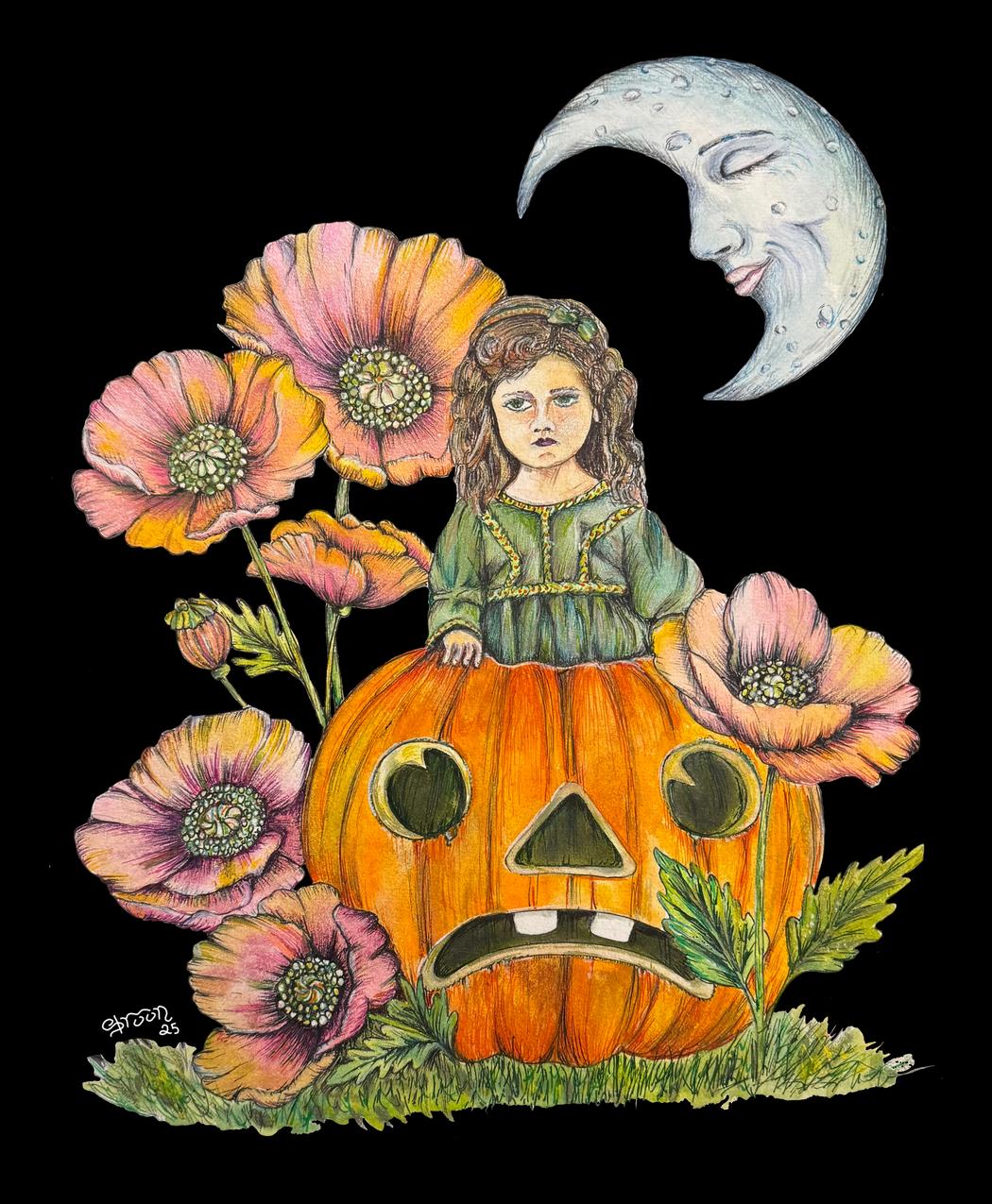 Many of your artworks blend nature and imagination—poppies growing through pumpkins, birds perched on florals, seahorses wrapped in blossoms. What role does nature play in your storytelling?