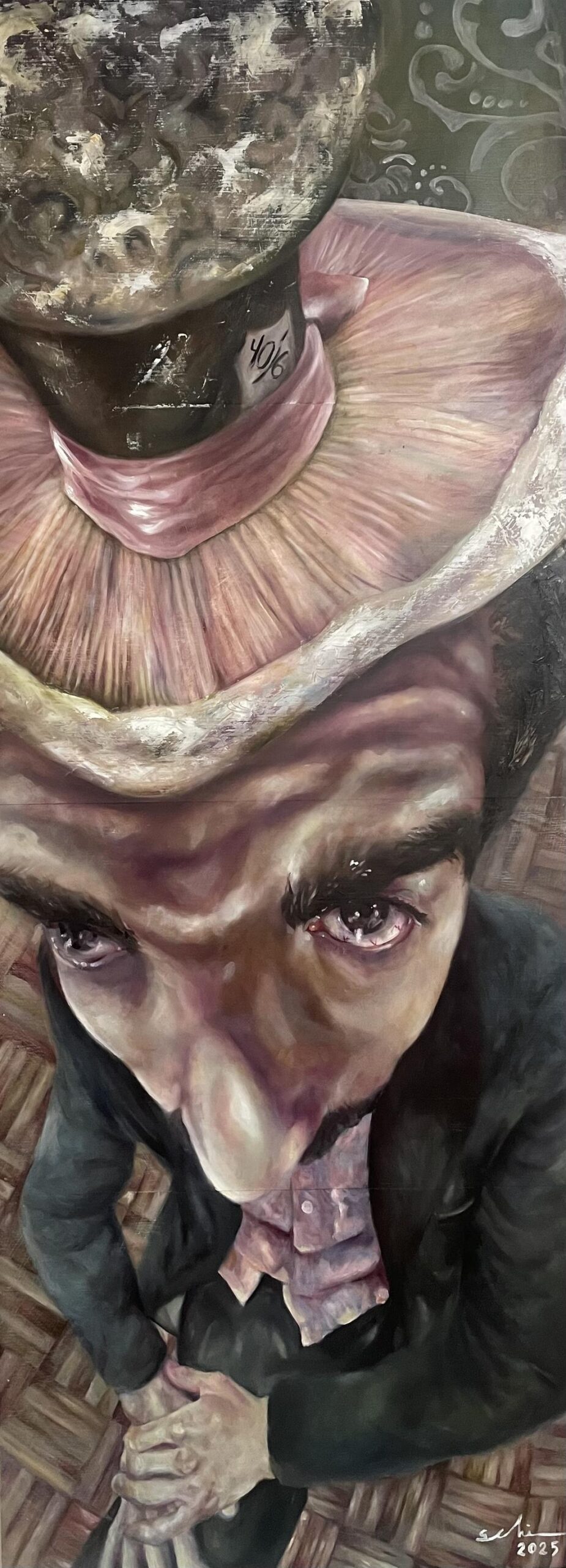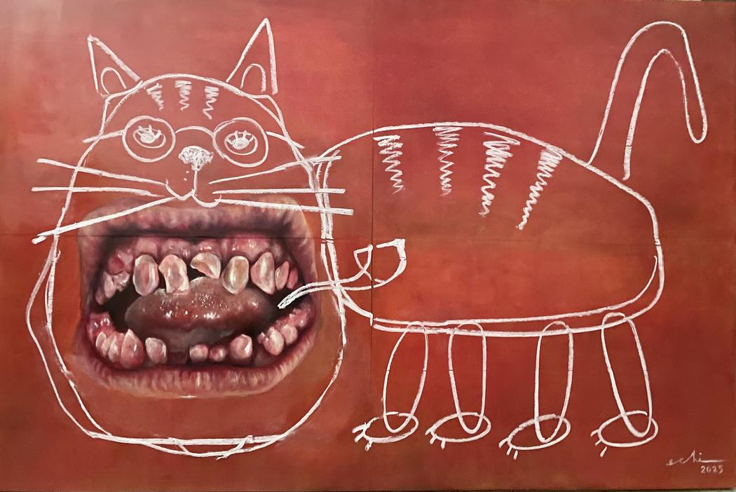 Humor and absurdity seem to coexist with existential tension in your works — for instance, the cat with human teeth or figures emerging from surreal contexts. How do you balance irony and seriousness?