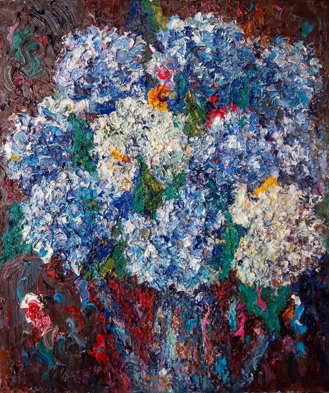 Working in multilayered impasto technique is not easy — it requires patience. It can take months to complete a single painting, and full drying may take up to several years. During this time, the canvases, in a way, continue to paint themselves.