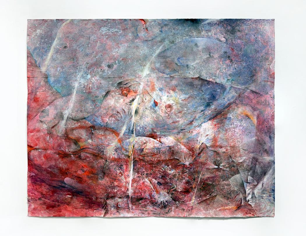 I’m interested in how these physical traces capture time — the duration of making, the movement of the body, the effect of the environment. The painting becomes a document of its own making, holding a quiet history of those interactions. Working on the floor allows me to approach the work from all sides. I don’t see the paper as a passive surface, but as something I move with, press into, and respond to. That intimacy and physical exchange is something I find both grounding and conceptually important.