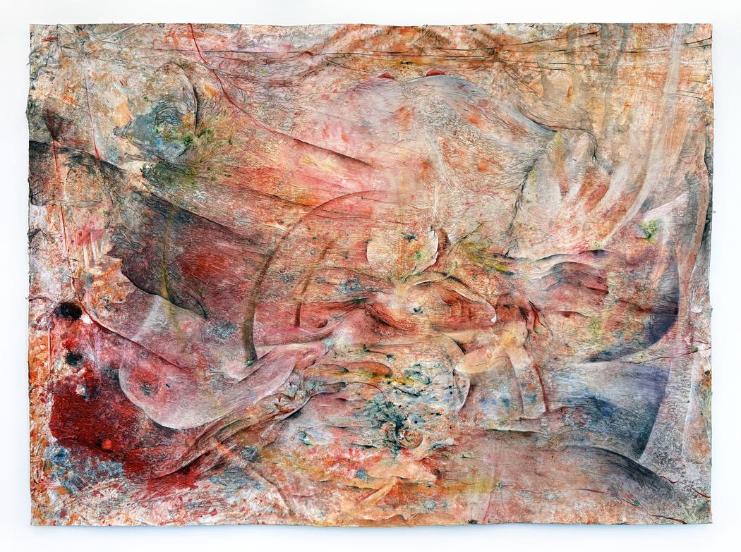 I use large, sweeping gestures with pigmented glue, and then build up the surface with small, intricate marks. I want the viewer to have a dynamic experience—stepping close to trace the fine terraces of a landscape, then pulling back to see an atmosphere emerge, a body-like form inhabiting the space. The multiplicity of viewpoints, like fragments through shifting lenses, allows the work to live between scales and states: landscape, memory, body, and dream.
