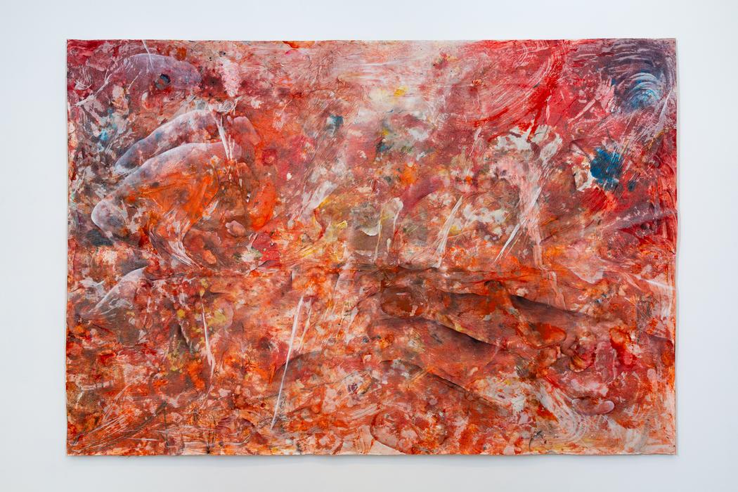 Bodily engagement is central to my practice. There’s a performative aspect to the making process that doesn’t always translate directly into the finished painting, but its traces remain. You can often find fingerprints, footprints, scratches on the paper surface, or areas of paint shaped by gravity when the paper was lying flat. These marks record the interaction between my body and the material.