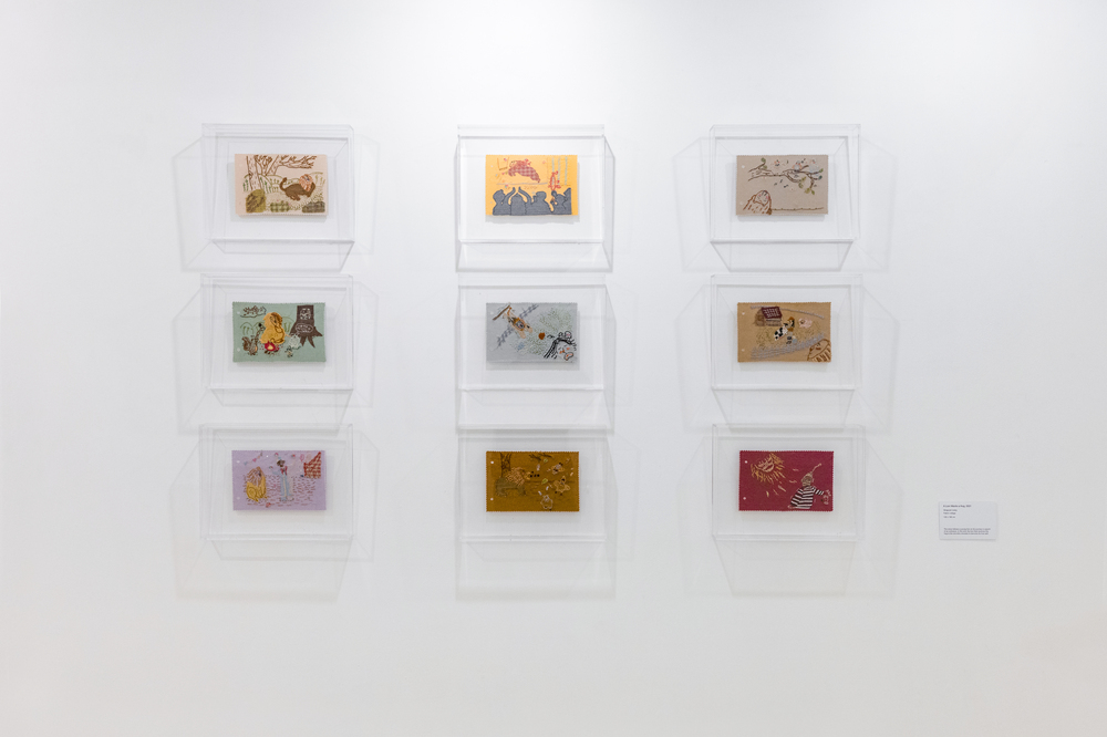 The exhibition’s most significant piece is the fabric narrative work A Lion Wants a Hug. A small lion journeys through the process of seeking a hug. This simple-seeming story conceals profound psychological motivation. It speaks of ‘seeking love’ and how a person learns to believe: their emotions are worthy of being held. Fabric becomes pivotal to this work, soft, prone to wear, always wrapped around form. In this piece, the fabric transcends materiality, functioning more as an emotional skin.