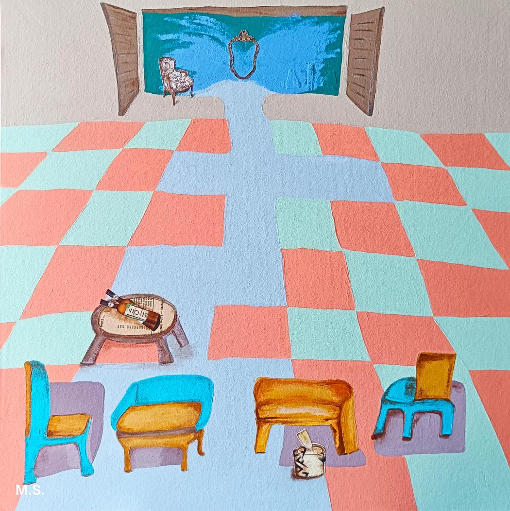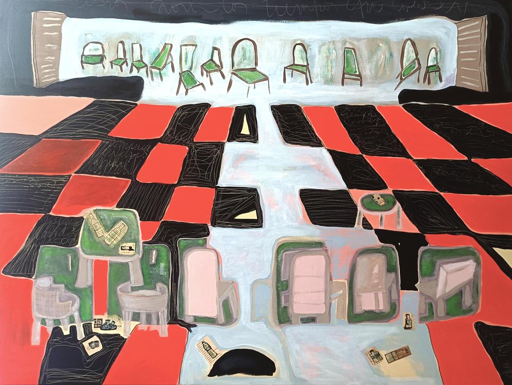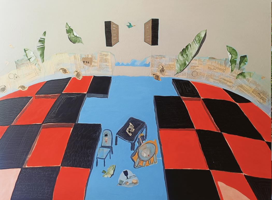 The checkered floor appears almost like a stage where objects “perform.” What draws you to this motif, and what does it symbolize in your visual language?