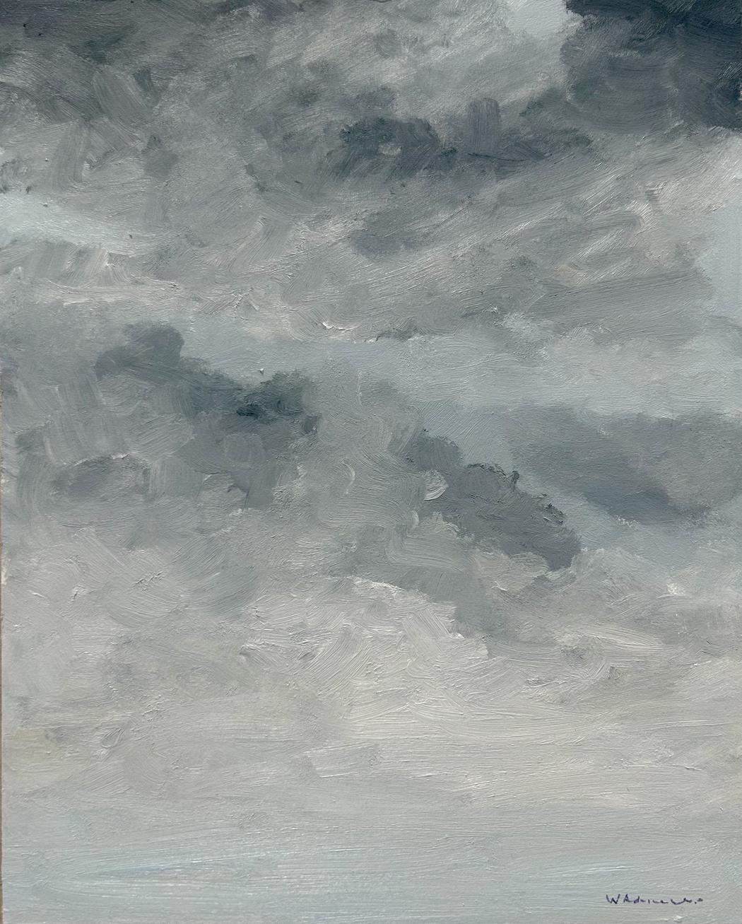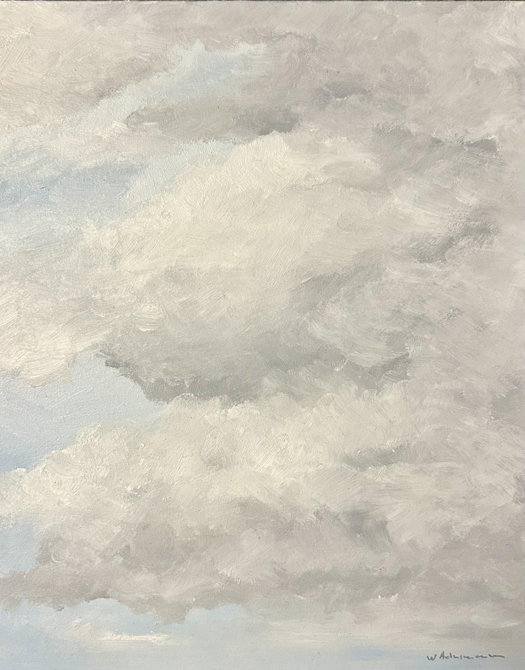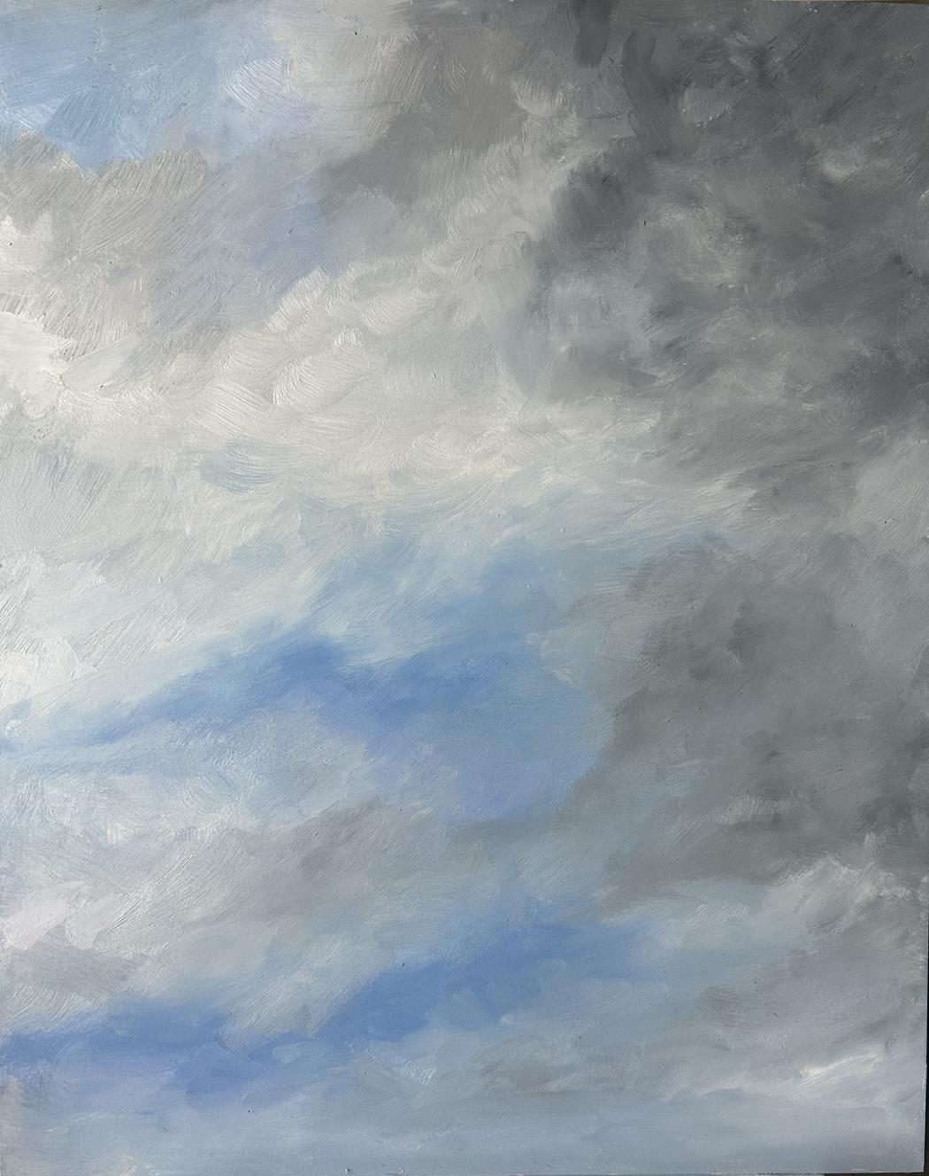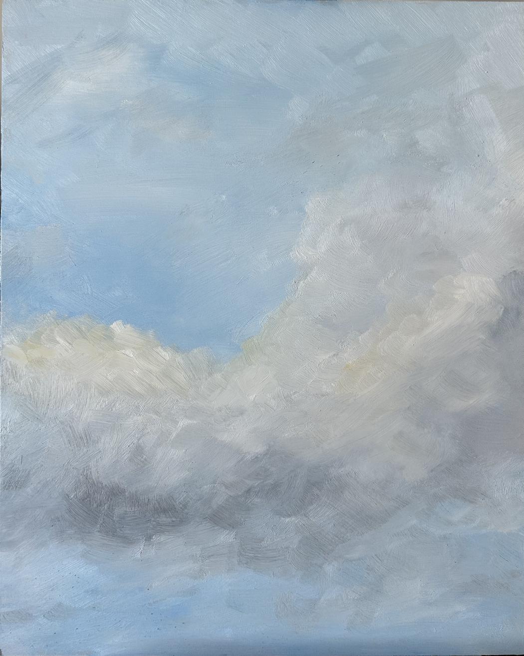 In my cloud paintings, I aim less to depict than to suggest. The cloud becomes a pretext — an anchoring point that allows me to stay connected to the real while moving beyond it. I navigate the balance between representation and abstraction through gesture: it determines how readable, dense, or dissolved the image becomes. A cloud is both form and movement, matter and disappearance — an ideal subject for exploring that shifting territory where the image remains recognizable yet already drifts into something else.