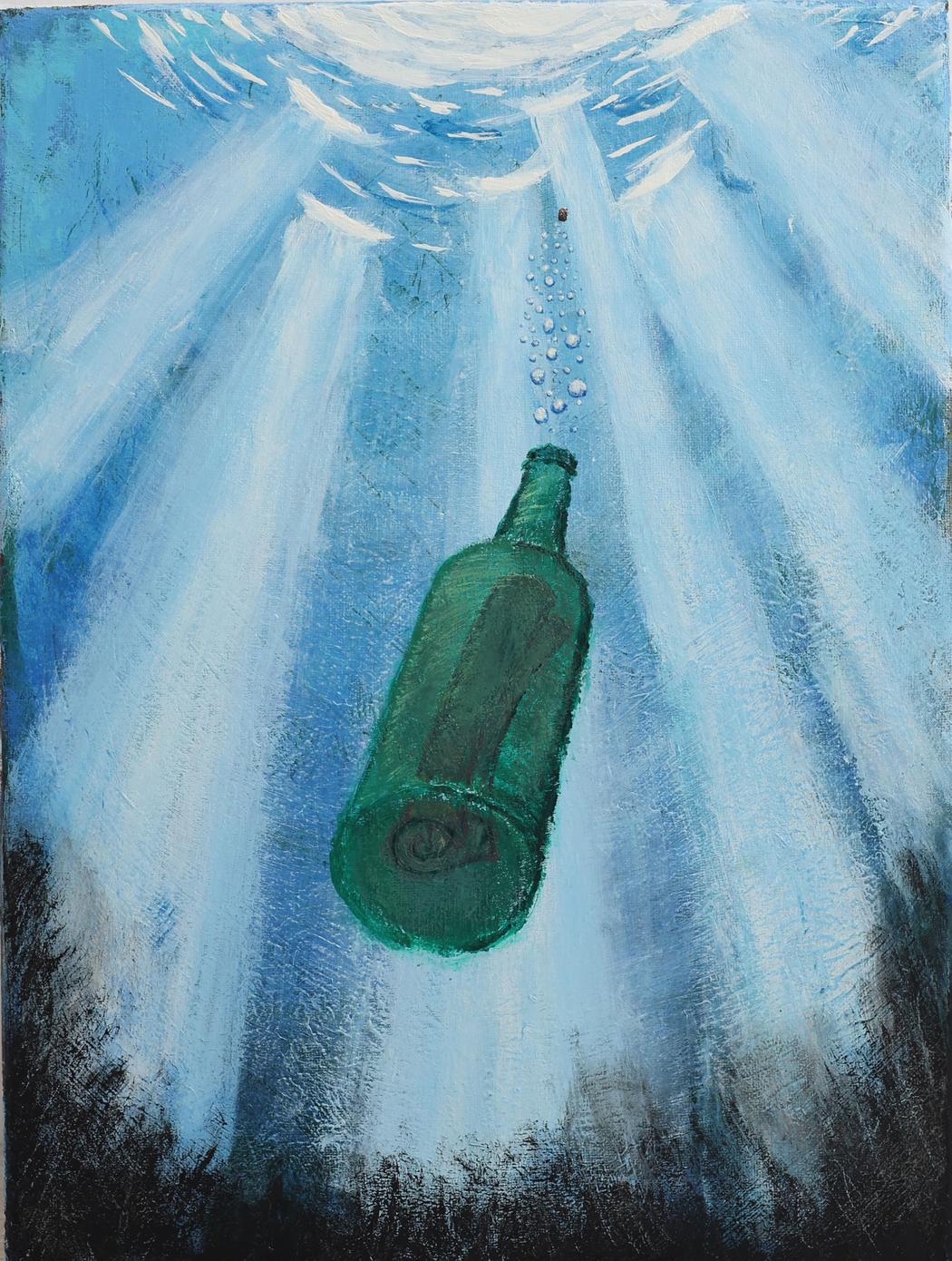 I try to use simple or even everyday symbols — those a person encounters in daily life — and slightly transform them (and sometimes even break their usual perception). For example, the theme of loneliness is not just a solitary object (or the image of a person placed within it), but the very process of walking into loneliness. Let’s return to the painting “Lost in the Depths”: a bottle with a message that is slowly filling with water. Hope is physically sinking, and there will soon be no air left to carry even a cry to the world — ahead lie only dark depths.