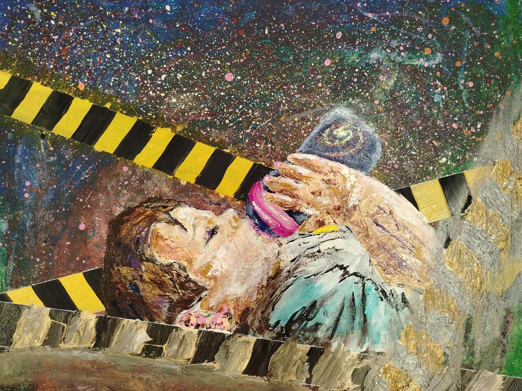 Another example is the painting “Wash Your Hands Before Eating…”. The fear for one’s child is not only parental embrace, but also the attempt to shield them with a kind of warning tape that begins to melt from parental anxiety and control (as a parent of two children, I’m already noticing this tendency in myself).