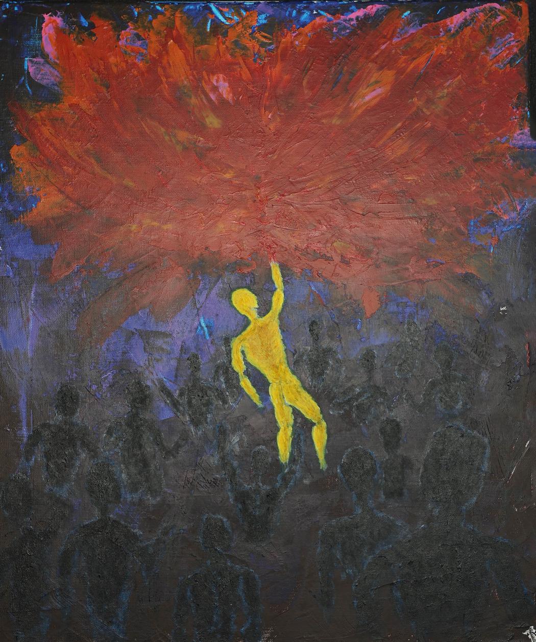 I’ve always been irritated and deeply affected by this universal tension of “having to conform.” The painting “Awakening and Realizing the New” is precisely about that — the sharp, painful moment when your old points of reference (your parents, familiar environment, or even long-time friends and mentors) stop working, while the new ones are not yet clear. You begin to glow from within with new ideas, and the people around you often perceive that glow as a threat.