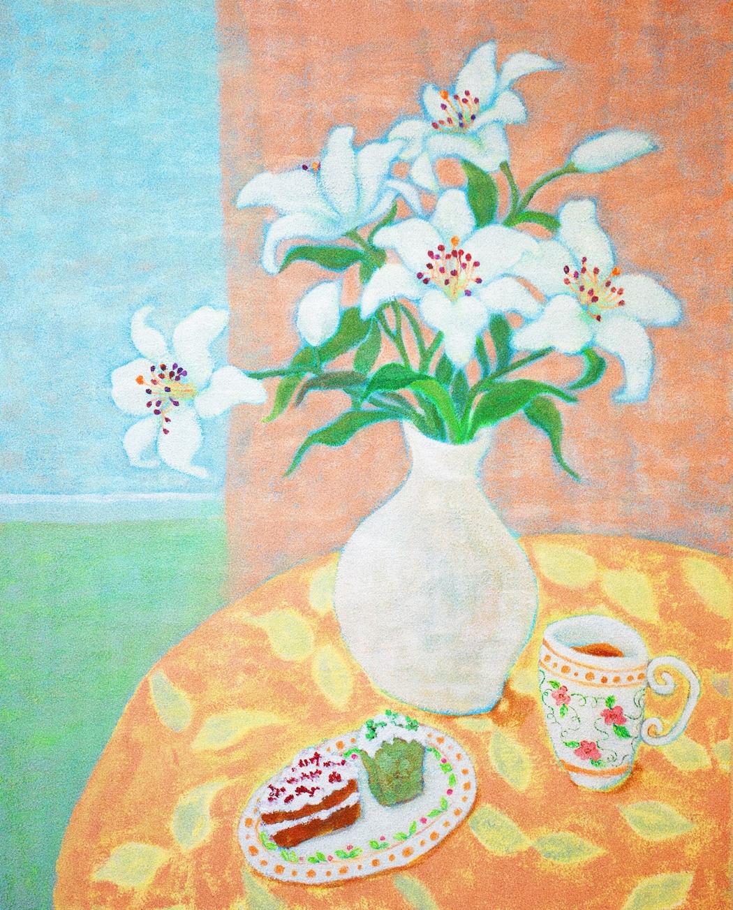 I see light as the emotional catalyst in my storytelling. For example, in my work Lilies, the sky light filtering through the window and the warm orange tones create a cozy, gentle atmosphere that conveys a sense of joy and contentment. Similarly, across my other pieces, the presence of light makes flowers and figures feel as if they are gently embraced by time.