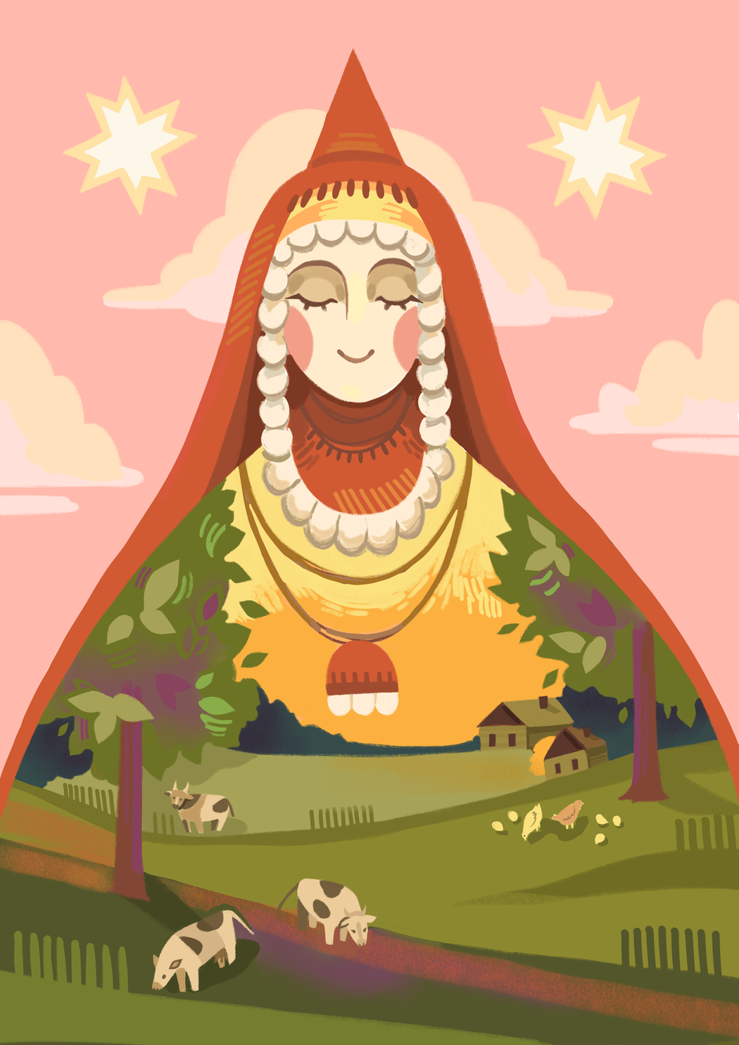The landscape in your illustrations often feels inseparable from the female figures. How do you perceive the relationship between women, nature, and ancestral memory in your work?