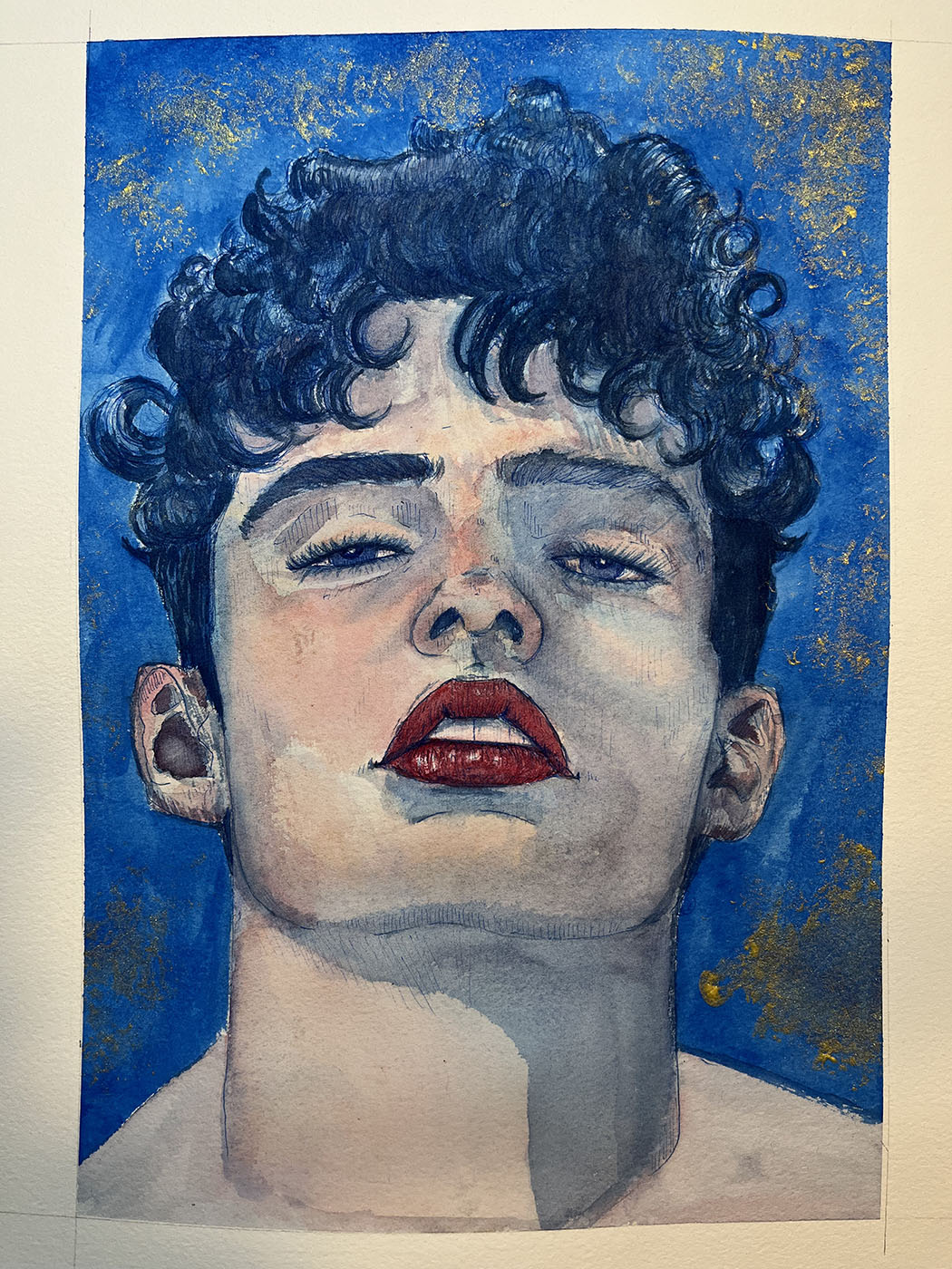 With watercolour and ink, but also with soft pastels, you can touch and capture the essence of a person, even if the portrait will always differ from the original, the artist is less constrained in expressing themselves freely. I try to express how I see and perceive the subject, nothing more. I do not seek exact morphological correspondence but rather what a face or body expresses, what comes to me from it, which I translate with water and colours.