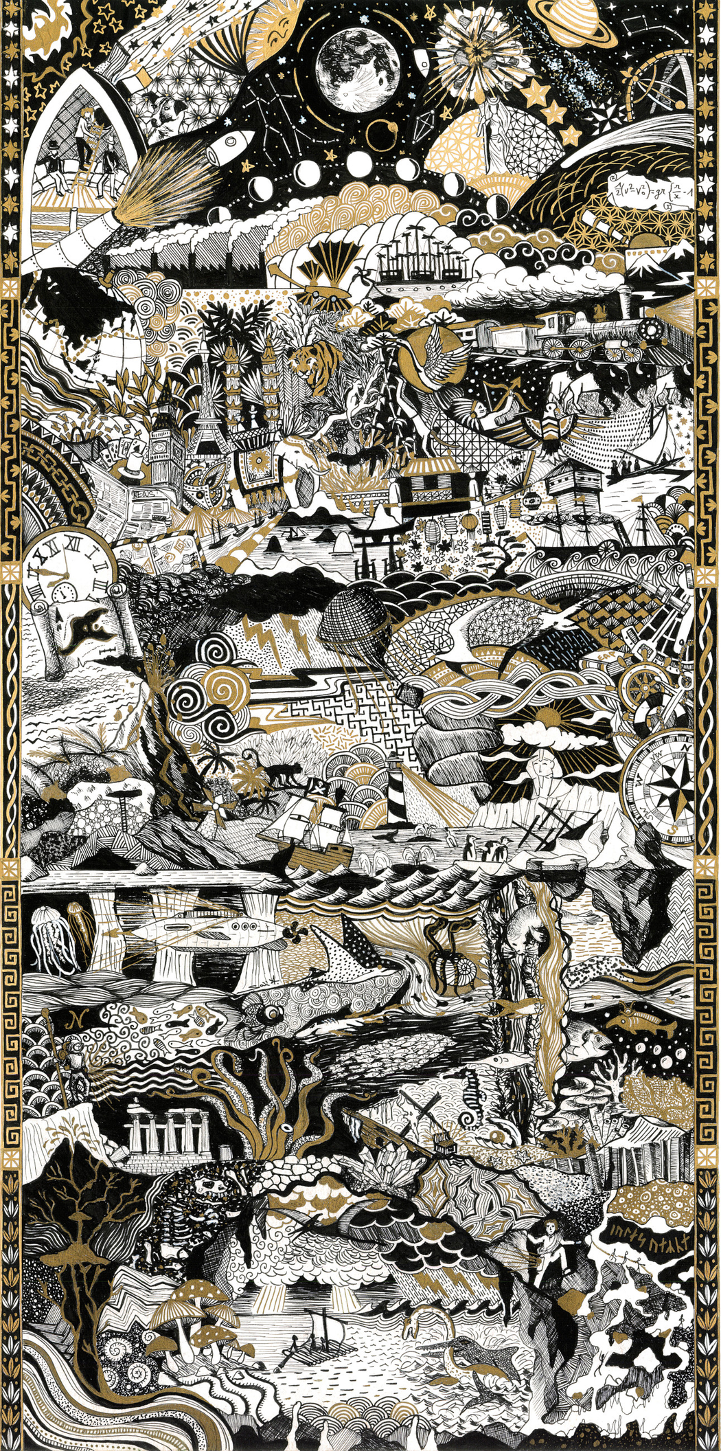 It’s hard to say. There is still a mystery, even for me. This horror vacui—this fear of the void that I express—is viscerally anchored in me. It is both physical and philosophical. I am looking for harmony, order, and meaning. Filling a whole page, making a dense composition, filling in the gaps, helps me to feel more comfortable with myself—deep inside—and to feel more comfortable with the outside world when I leave my studio. If there are so many details gathered in my artworks, it is because there are so many thoughts and so many emotions running through my mind. Drawing the way I do helps me to channel my mind. It gives me both a sense of control and release.
