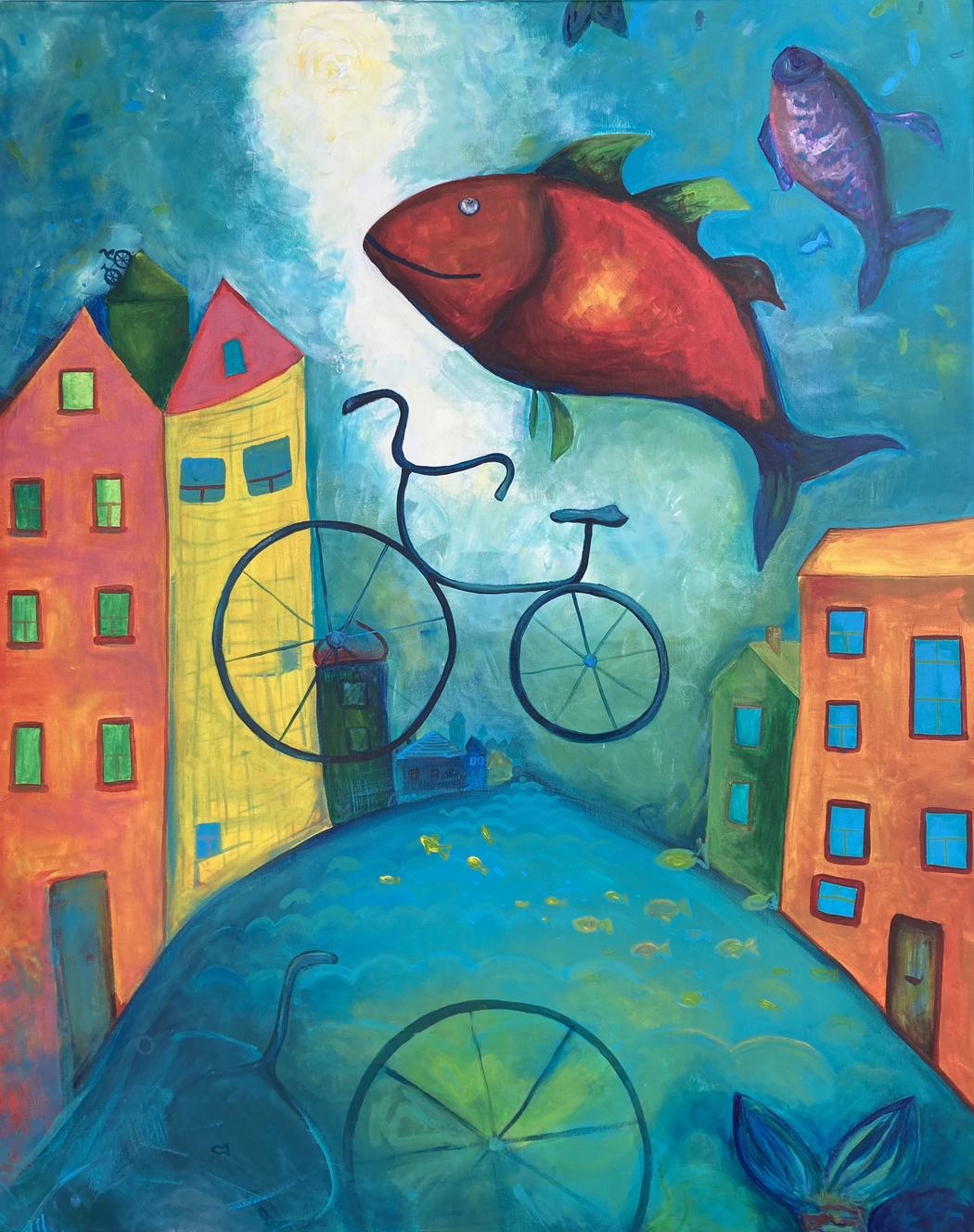 My first work with fish appeared in 2023, when I was still processing my initial sensations after relocation. It depicted a fish riding a bicycle through an underground city, a metaphor born from a very physical experience. I imagined a freshwater fish suddenly finding itself in a cold, salty sea: the density of the water changes, movement becomes heavier and slower and everything requires more effort. At the same time, this slowness allows the fish to look around, to notice the world and to begin questioning who it is within it.