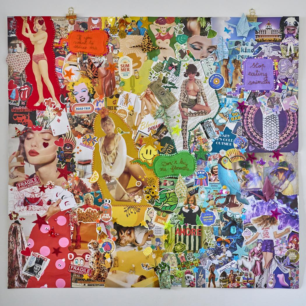 My background in mental health made me very interested in what we project onto images. I think in layers, contradictions, defense mechanisms. At the same time, I allow myself a very intuitive, almost childlike freedom. Bright colors, stickers, playful compositions — joy is not superficial to me, it’s psychological. My collages often mirror internal states: abundance, fragmentation, overstimulation, tenderness. I’m less interested in linear stories than in emotional landscapes — the kind that feel familiar before they make sense.