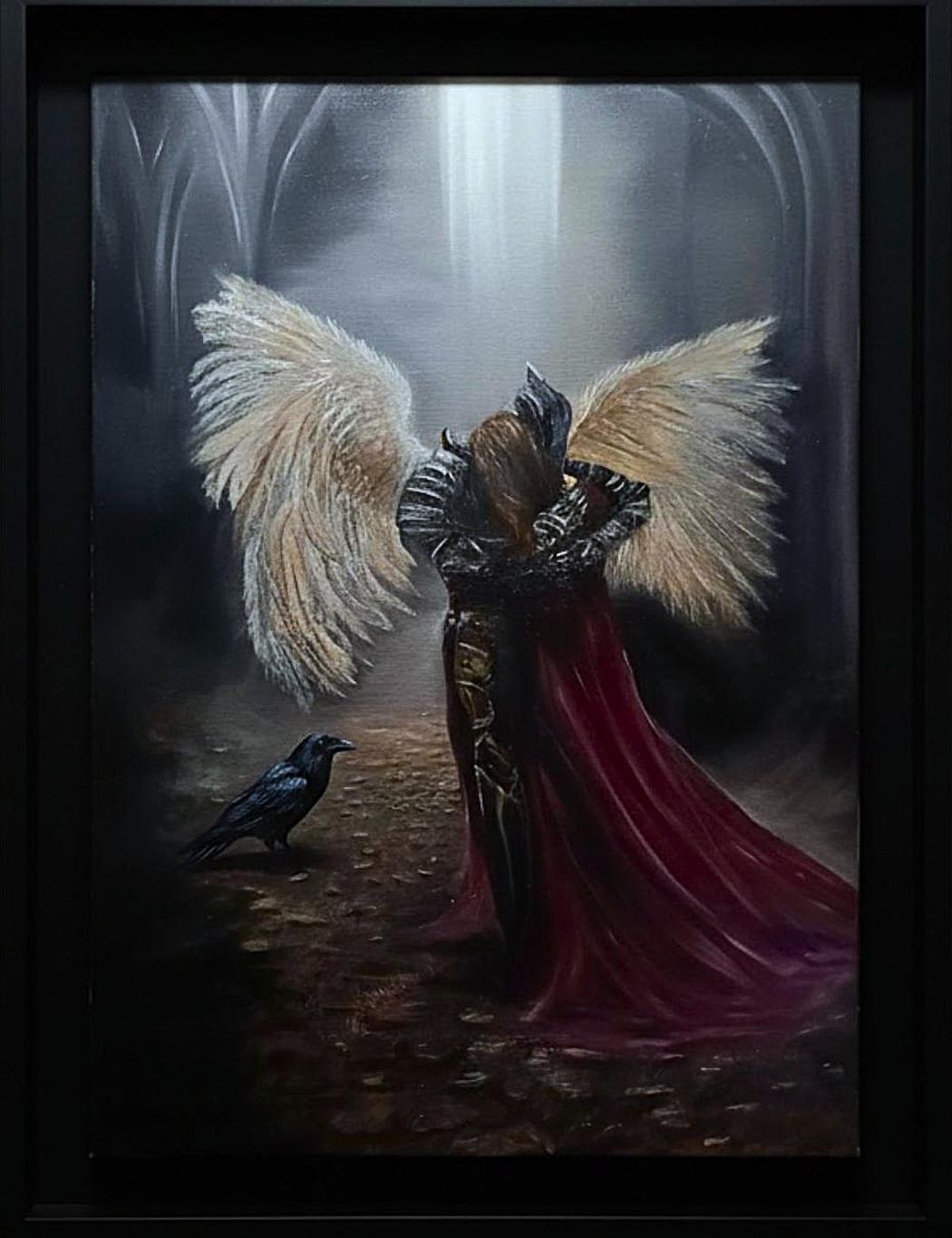 Ravens function as quiet guardians in my work like observers rather than symbols of foreboding. Solitary figures reflect introspection and inner presence. Together, they suggest awareness, protection, and a sense of calm companionship rather than isolation. Ravens also bring the story of my paintings together.