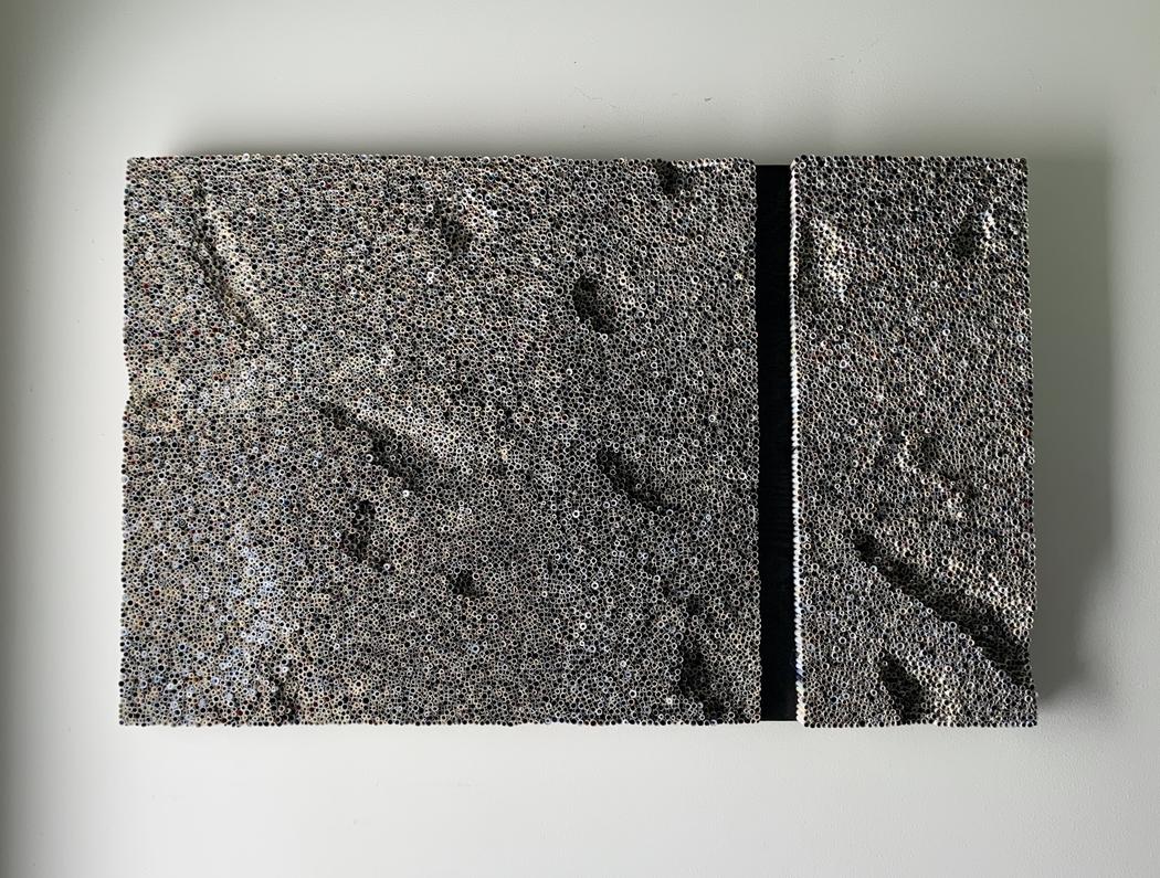 Light and movement are central to how the work is experienced. I cut the rolled elements to varying lengths, so as a viewer moves around the piece, the surface shifts. Changes in light, whether natural or artificial, alter the shadows and subtly shift the visibility of color.