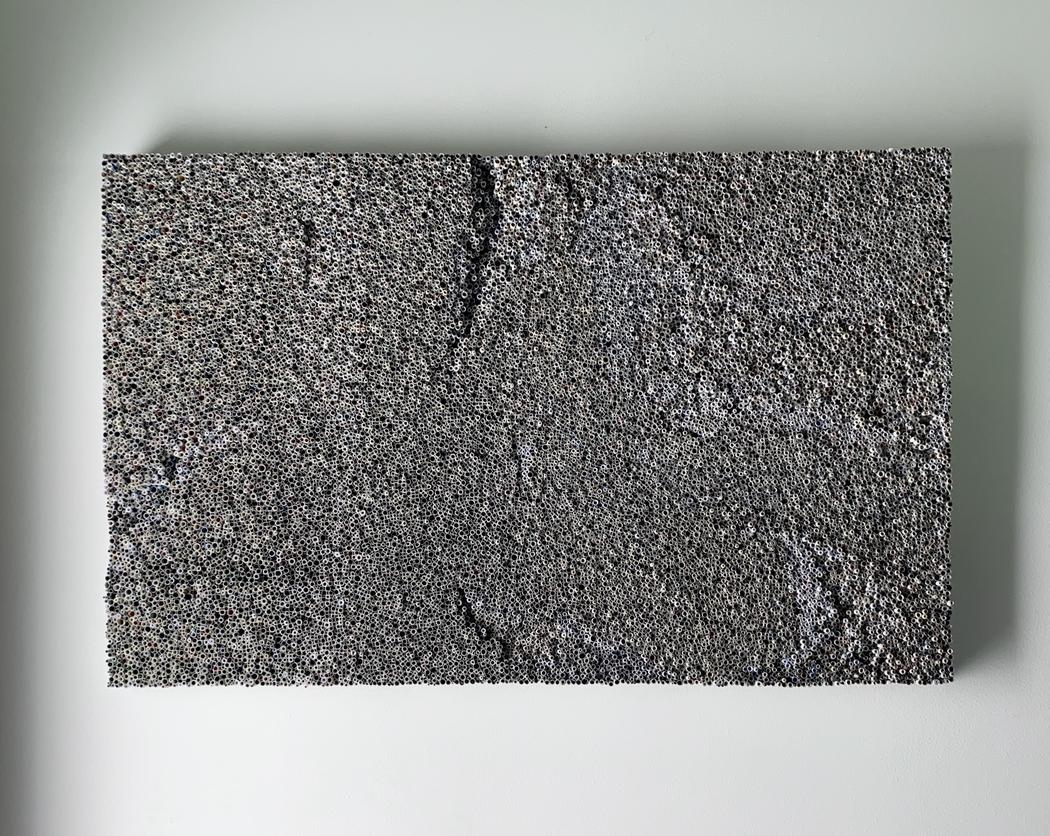 Distance also plays an important role. Up close, the work reads as a dense field of individual forms. From farther away, the surface begins to soften and unify, and larger patterns become more apparent.