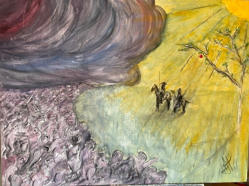 We have become anonymous. The notion of individuality has been displaced by our conversion into commodities, ATM machines and useful idiots manipulated by a select few with distinctly ulterior motives. Bill Gates would have us eat “kale,” while not foregoing the consumption of Wagyu for himself. Jeff Bezos has us buying cheap goods from China, while silencing those who point out that it is a totalitarian and genocidal state. Peter Thiel portrays himself as a “libertarian,” while investing in companies that suck every bit of data imaginable about all of us into a centralized collection center. Elon Musk . . . Enough said. We now have left wing/right wing/race/gender and other political movements that garner popular support through the creation of attractive ideologies, without ever revealing the realpolitik objectives of those financing them. In the interim, we have seen the diminishment of the middle class into a distinct minority, a correlating increase in the poverty class and public polarization on a scale that far outstrips anything seen in the 1960s. This, then, is the point I am trying to make when I paint human figures that depict we the masses in my political paintings. My distortion of Gates, Bezos and Buffett, for example, in “Let Them Eat Kale” is an attempt to depict my interpretation of them as they really. Corrupt and broken and dangerous. Conversely, my diminishment of Don Quixote and Sancho Pancho in “Mierde,” speaks to a lack of hope that we can, or even want to, overcome all of the foregoing.