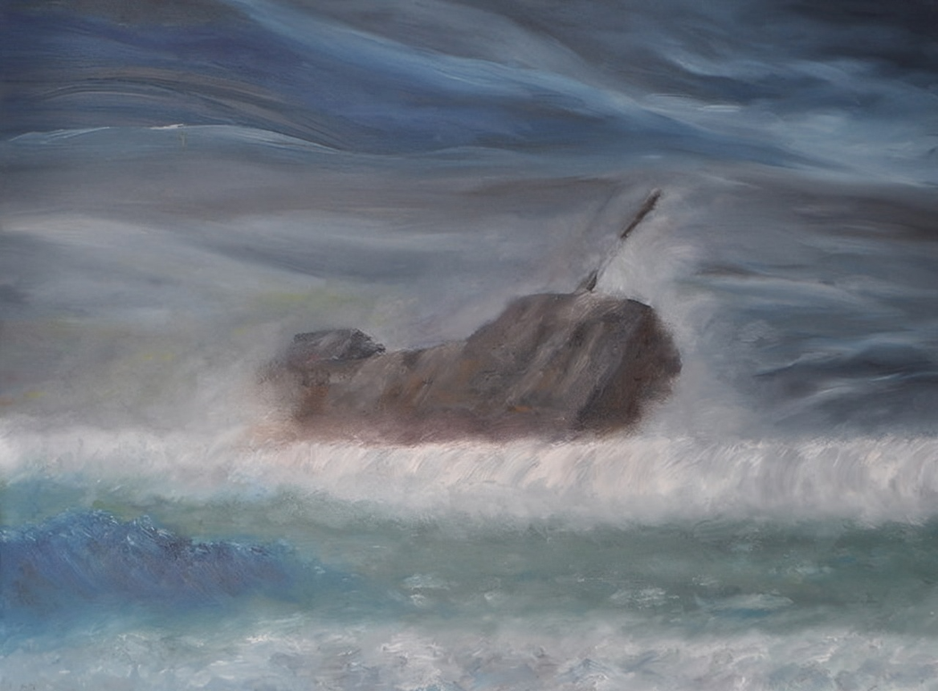 I do not believe that the concept of a fluid universe is an abstract concept. It is a fundamental law of nature – that nothing remains in the same state forever. That said, and perhaps this would be less of a problem if I were a better artist, I am only capable of capturing an instant in time within a sea change and hope that the viewer can envision that it is a mere instant within an ongoing transition. Thus, I can paint a shipwreck and hope that the audience will recognize that it was once something else, a living thing, home to a crew going about their business, while plying the vessel’s trade, and that it will eventually decay into even less than the moment it was captured. Or, that a painting that attempts to make a political statement raises questions about the events leading to the need to make that statement and what will ensue.