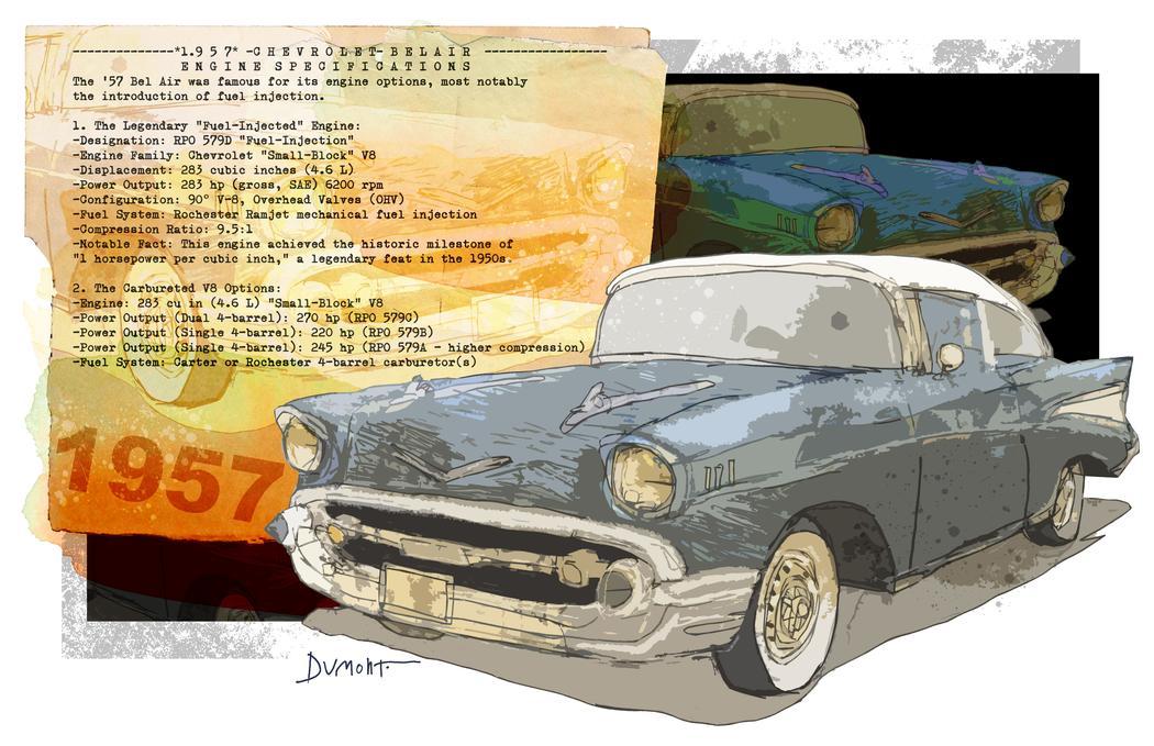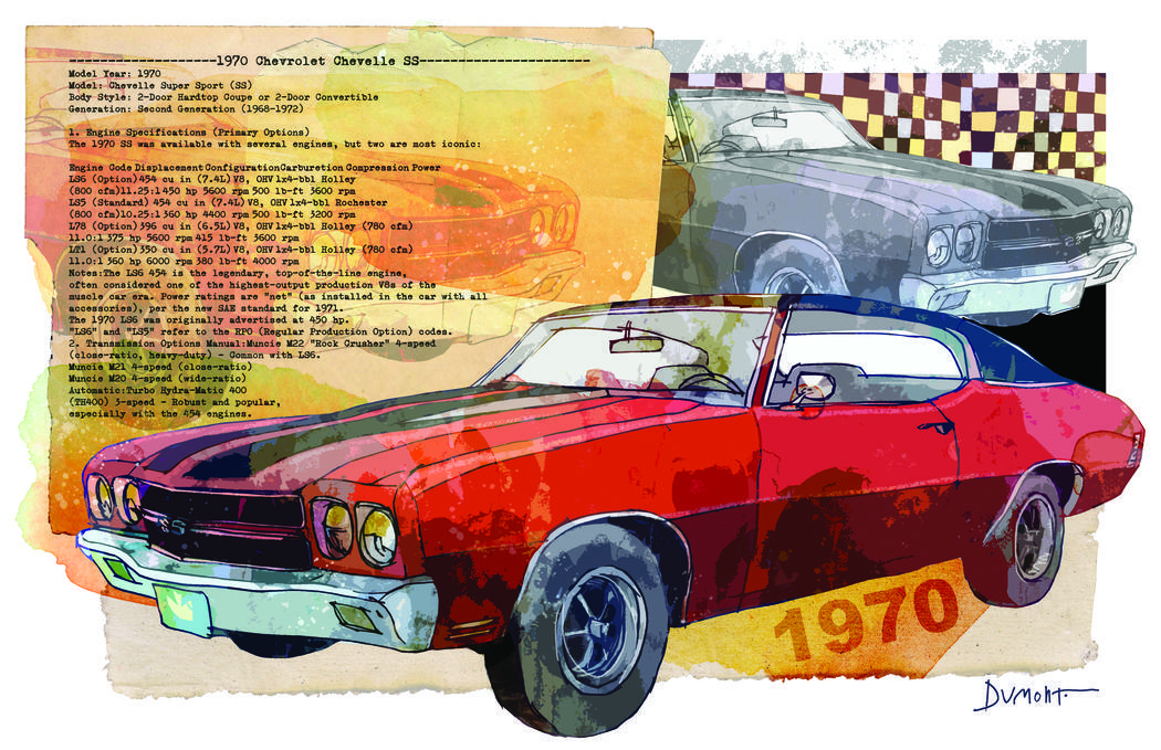 I have loved muscle cars since I was a teenager, with their robust shapes and powerful engines filling my soul with excitement. When I turned 20, I was fortunate enough to buy a 1974 Dodge Dart Sport GT. Over time, I was able to restore it completely—a task that required patience and a great deal of time invested. This illustrative work on classic and vintage cars is fresher and more fun; it’s my time to relax. The car’s linework and the use of watercolor backgrounds that I personally created and scanned, then brought to life through layers and filters in Photoshop—all for these beauties on wheels. Moving between these two visual languages is easy for me; although they operate on different levels, I enjoy both, and they are both part of my life as an artist.