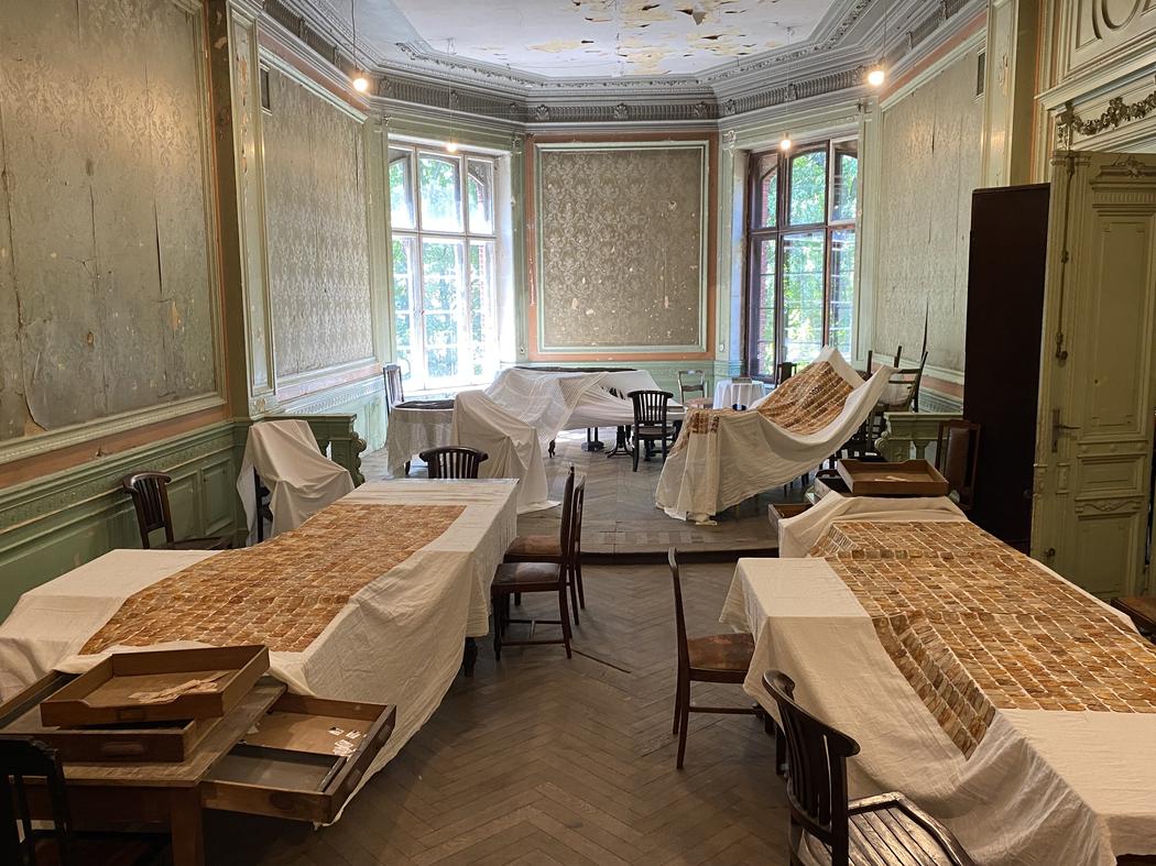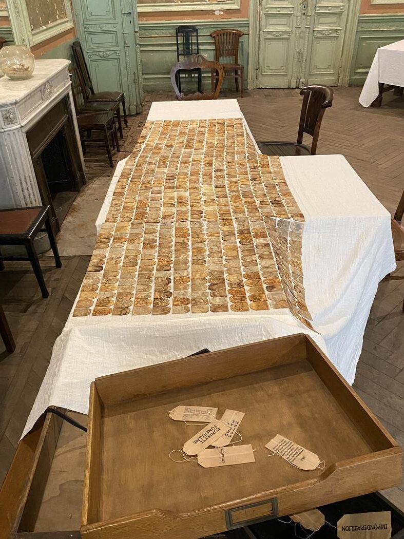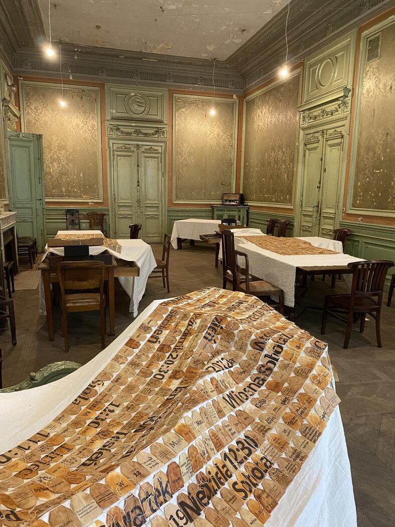 I have presented the installation in run-down, historic interiors of the Artistic Book Museum in Łódź. The collages were laid out on old tables. I risked having the works destroyed by encouraging the guests to take a seat directly at them, on ancient chairs. During the vernissage, a traditional Japanese tea ceremony took place. The gathered people drank it at the tables, putting the bowls on collages-tablecloths. I didn’t fear the works would be damaged because my willingness to create an atmosphere of community was stronger than my anxiety over damaging the delicate materiality of the collages. I didn’t worry that some of the teas would spill over the work. In fact, it did happen. The liquid dried and turned into a rusty stain that naturally integrated with the rest of the composition. The stain pleased me. Thanks to such interferences the documentary character of my work strengthens. Each consecutive exposition leads to a change in the creation – it bears a human trait. The works also deteriorate on their own: teabags dry, wrinkle, fade or darken, in this way the work reflects memory where something withers or gains power like a stubborn reminiscence.
