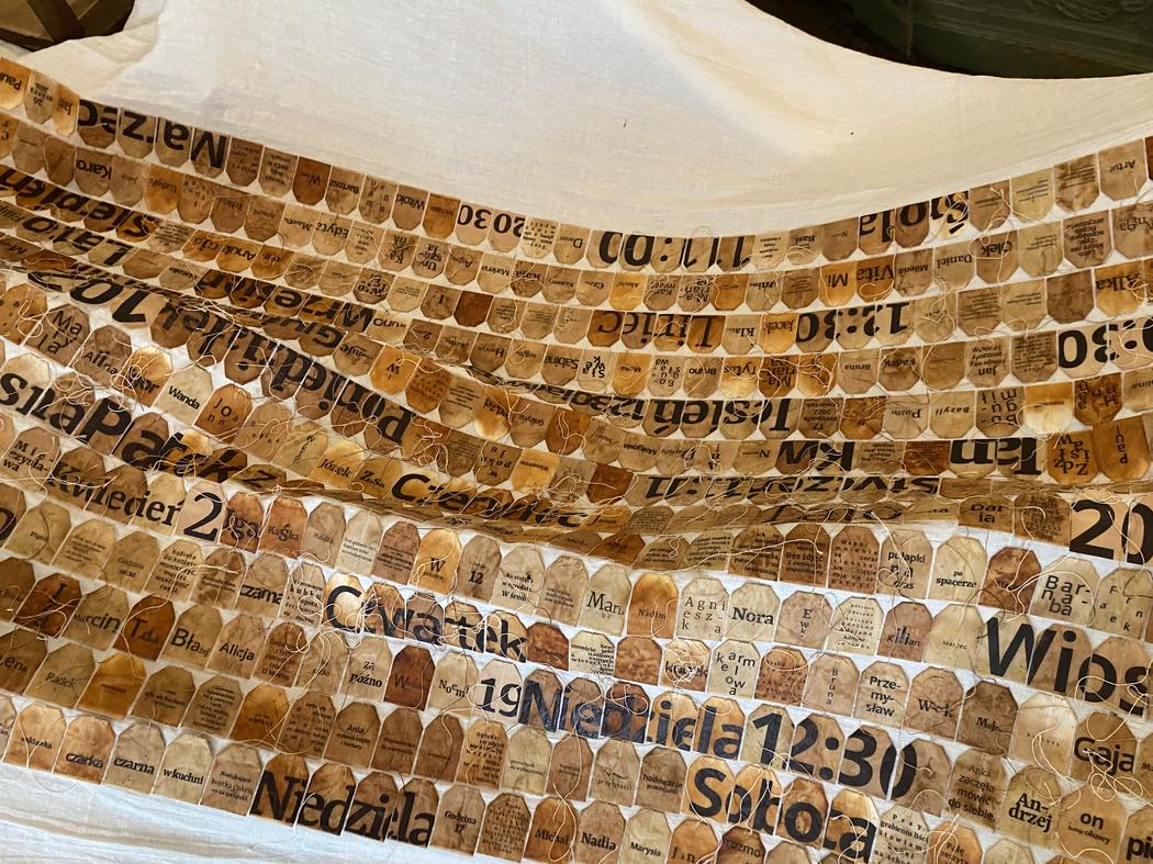 In LiTEAture – the title of the work is a wordplay between literature and tea – texts put on used teabags come from extensive documentation of tea-related conversations. They contain not only the names of fellow-tea-drinkers but also their personal insights, thoughts attempting to encompass the complexity of existence. Some have a poetic character: Things have roots, people see stems. / A soaking sugar cube, what a spectacle! / Mountains on Venus – eight-thousanders, they’re there as much as we’re here, can you imagine? Others recount everyday life with colloquial language: How can you drink bitter tea, my child? / My dog doesn’t know the taste of tea. / Mira died of COVID, she had it twice, and it was the second time. Imprints in the collage also contain details about the date, place and circumstances of the tea meeting: in the garden, in the kitchen, in the room, on the go, on Tuesday. The text on each teabag can be seen as closed and separate, but one can also seek semantic sequences forming between neighbouring bags. I composed numerous parts of the collage in such a way that neighbouring text would combine into associative wholes. The collage with word fragments complements the canvas-collages with photographic effigies of people with whom I have drunk tea. A peculiar archive comes into being: the portrait of a human being, their name, the time and place of drinking tea, a documented snippet of a conversation or a monologue.