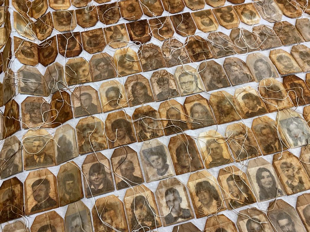 Many of the faces in the installation appear faded, almost dissolving into the tea stains. Is this fragility intentional? How do you think about disappearance and preservation?
