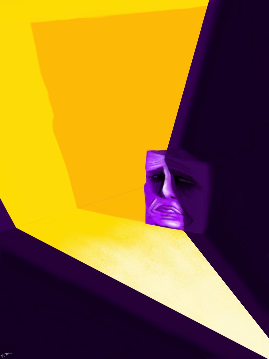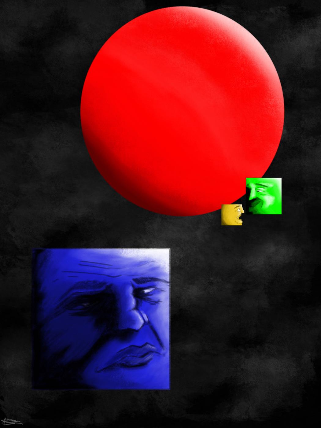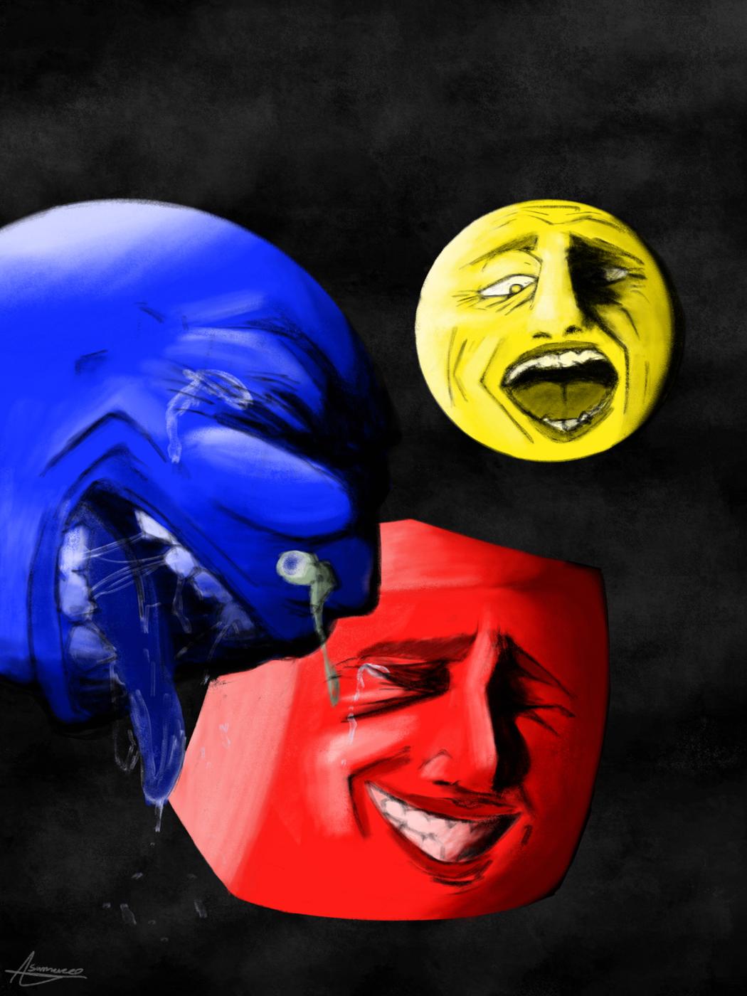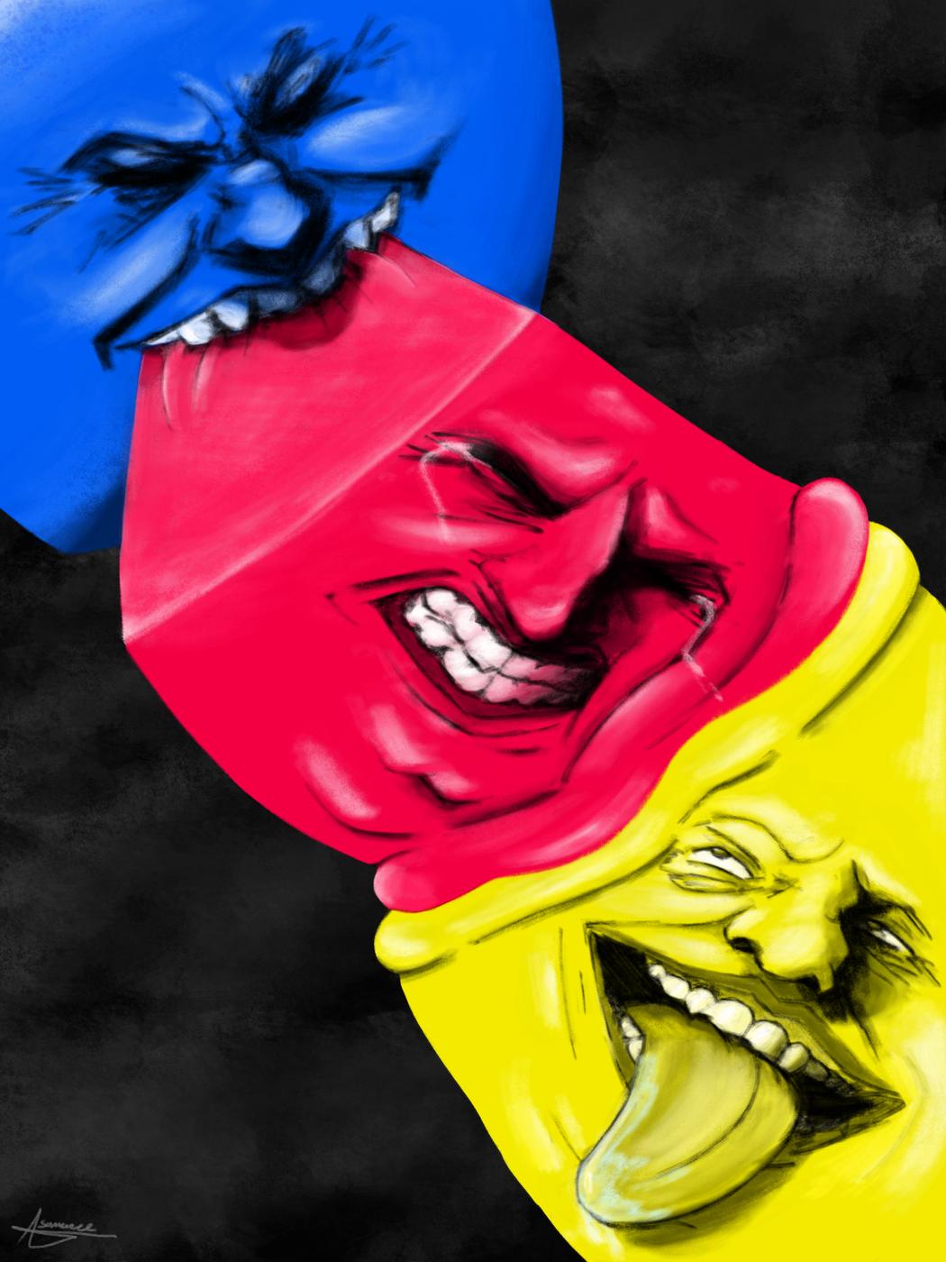 The beginning of the idea for a drawing usually starts with what bothers me. It isn’t about controlling how I feel but more just letting the feeling of the emotion happen and what faces would best represent how I feel about it. Starting with drawing faces and seeing what works, what doesn’t then to arrangement, sizing, positioning, and the perspective of the faces. Once all that is set in place then I draw my shapes for the faces to be on and any set pieces that will go along with it next is refining all my faces and shapes and coloring them in. Thereafter is picking where the light source is coming from and where the shadows would be casted. Lastly would be just doing small touch ups on coloring, lighting, or shadows before being finished.
