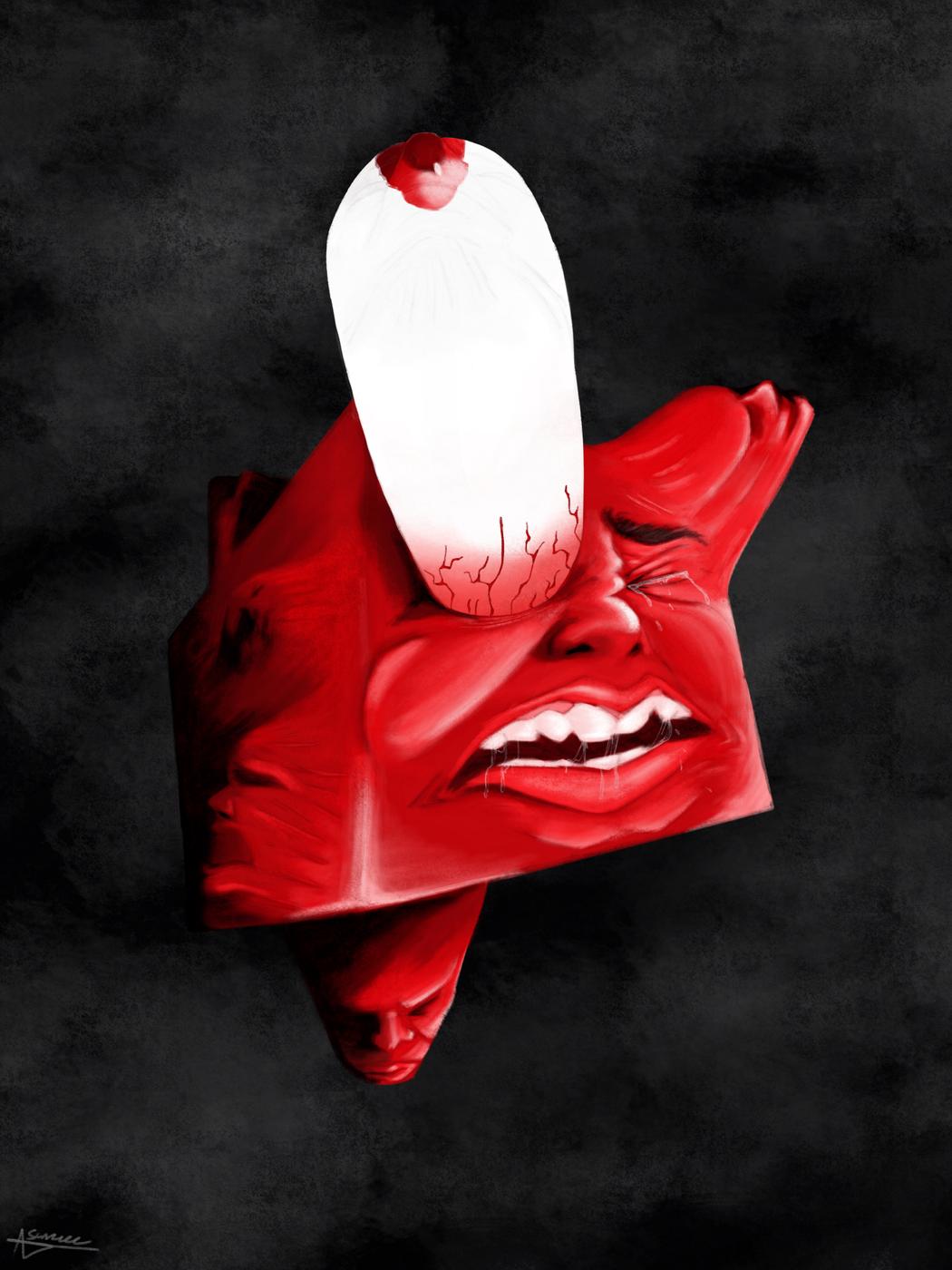 Your works often feature expressive faces and intense emotional states. What draws you to exploring human emotions through distorted or surreal facial forms?