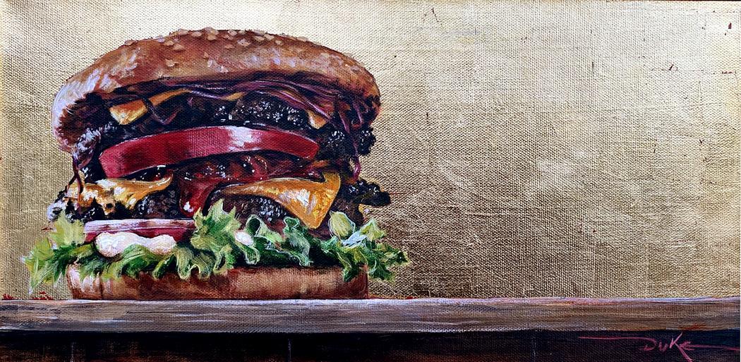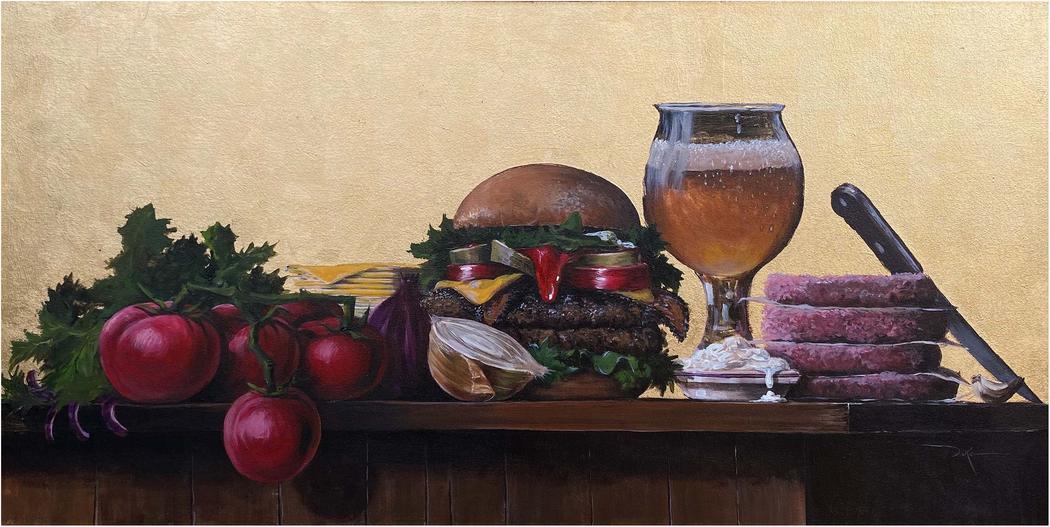 Many of my burgers are portrayed now just before the first bite, and that instant of anticipation carries deep meaning for me. It’s a charged moment, brief, intimate, and universal. Before the burger is consumed, it exists in a perfect state of promise. It represents desire, hunger, nostalgia, temptation, and the pure potential of satisfaction. Once the bite is taken, that perfection disappears. But in that suspended second beforehand, everything is still possible.