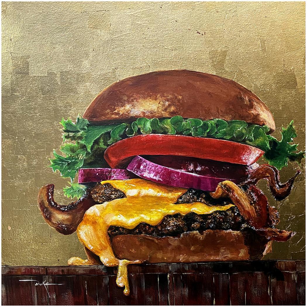 On a visual level, I treat that pre-bite moment as a contemporary still life, not yet altered, not yet “ruined” by action. It allows me to elevate a familiar object to the level of contemplation and symbolism. It becomes a standing for desire itself. The gold leaf amplifies this, turning a simple burger into something iconic, sacred, and almost untouchable. It reframes hunger, not just for food, but for comfort, identity, pleasure, and belonging.