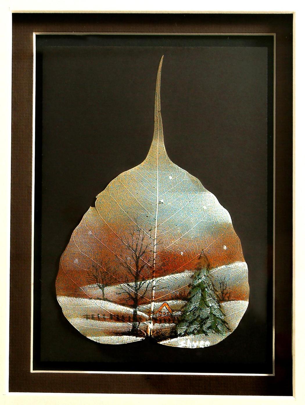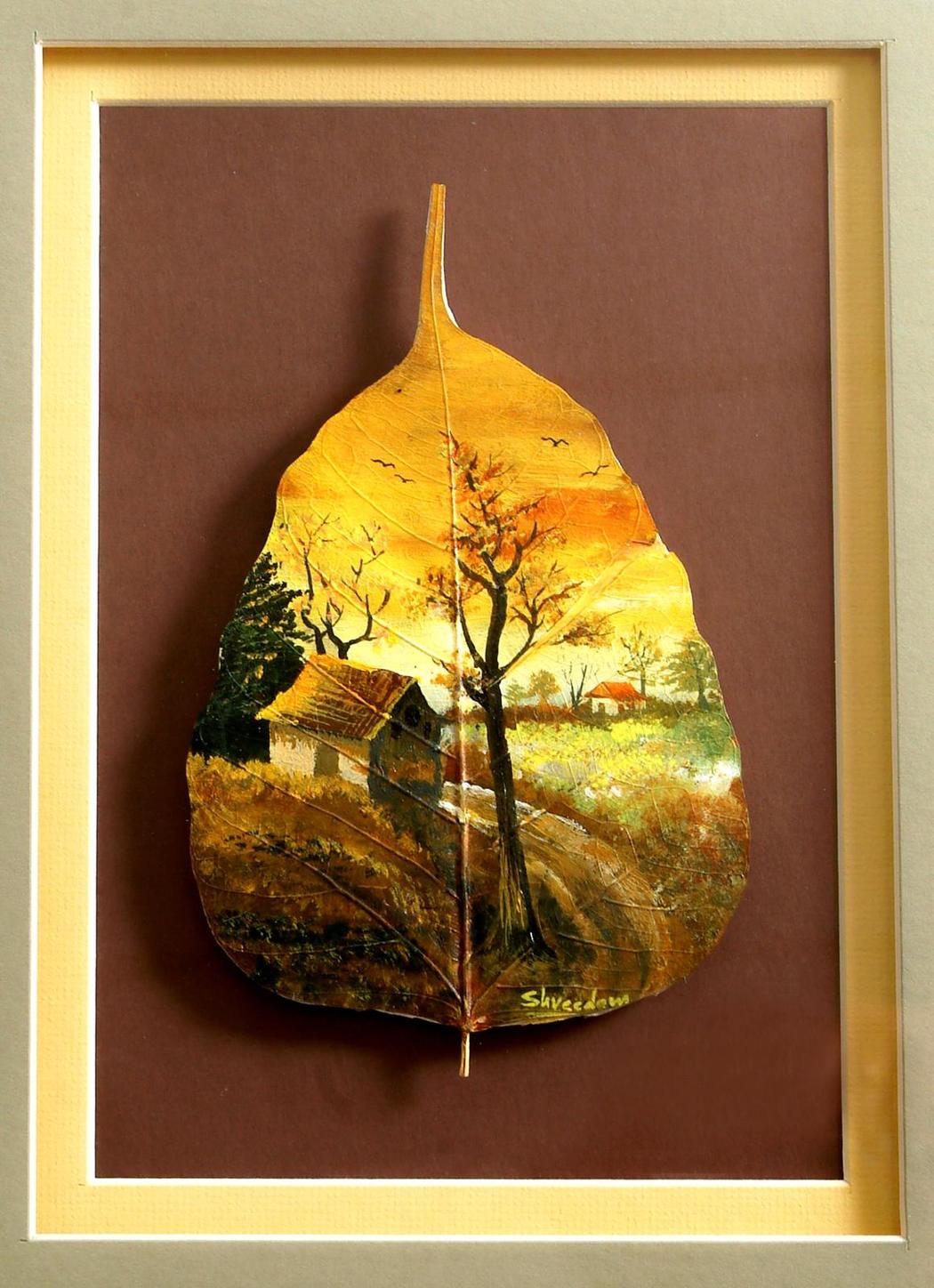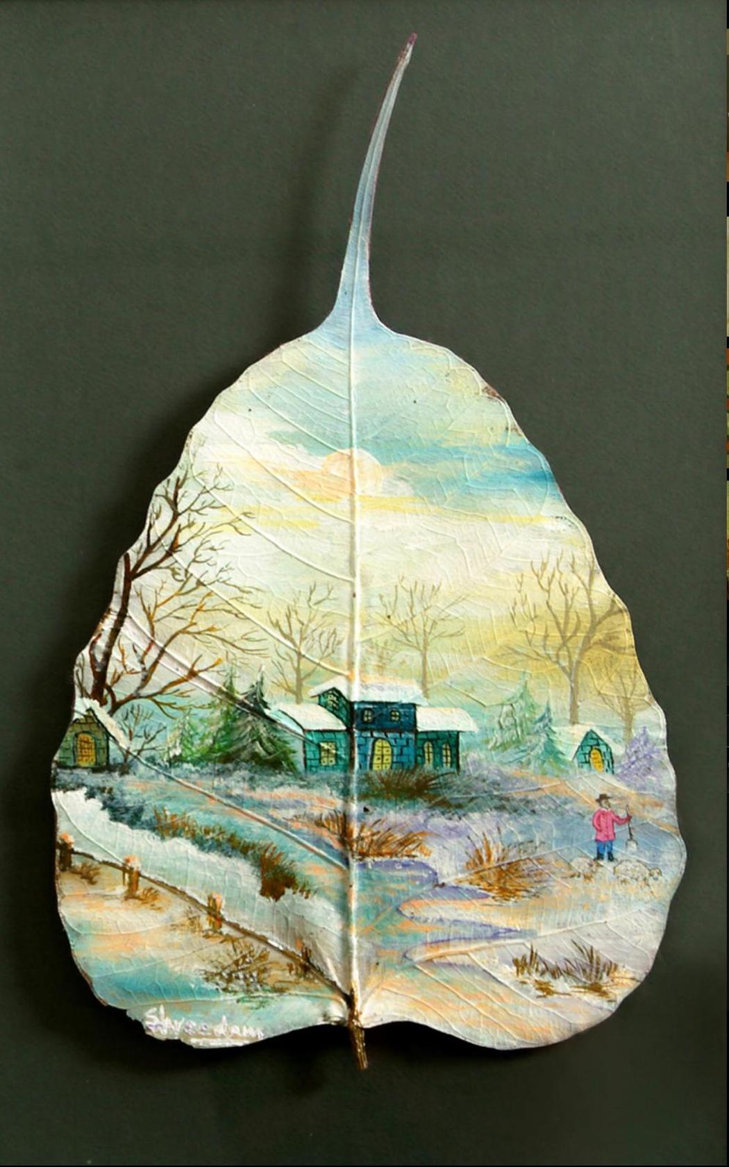 Your leaf paintings often depict peaceful landscapes and quiet moments. Are these inspired by real places or imagined worlds?
