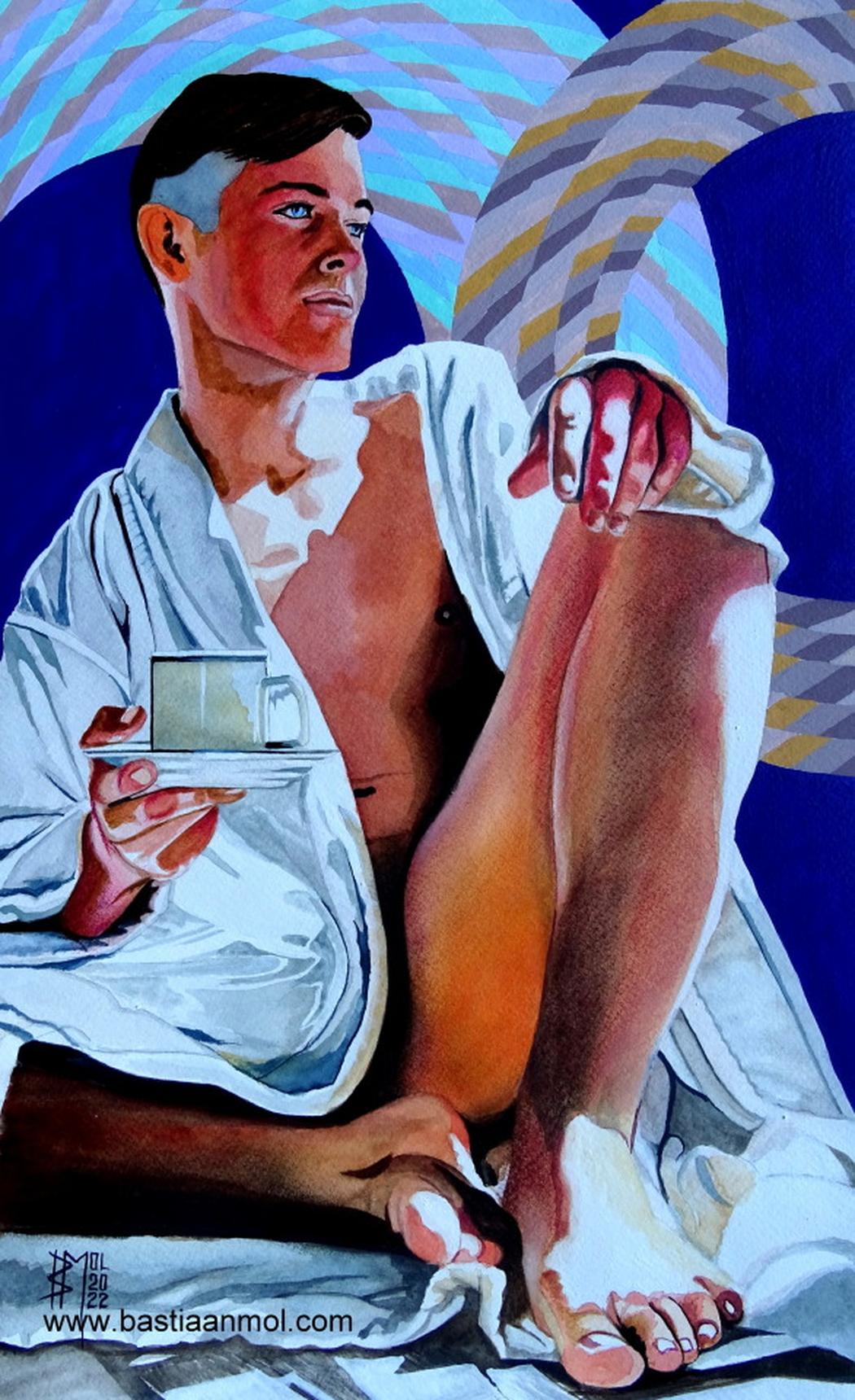 But the world changed. There is not just MEN or WOMEN. More and more the world becomes concious that there are also women that were born in male bodies and vice versa. And there also is a whole variety of people in between male and female, seeing themselves in other ways than ‘just’ a man or ’just ’a woman. I very much like to paint men in other ways than what the bible (or the koran, or other religions) wants to teach the world. Men don`t need to be depicted as a hero, They also can be soft, romantic, showing their feelings. And can also even be painted in a erotic way, as desirable beings. Not overly strong, but inviting,sweet or sensual.