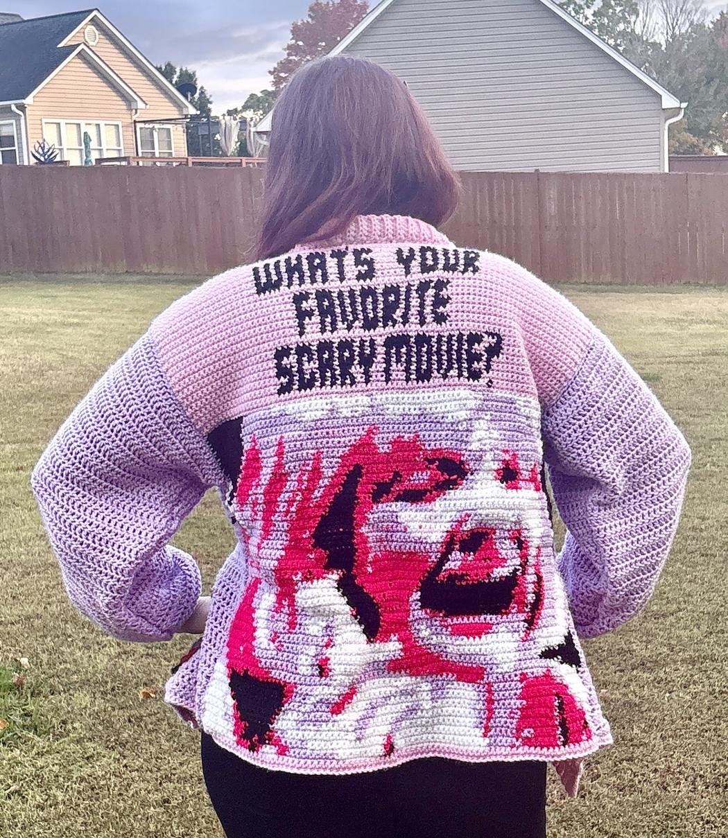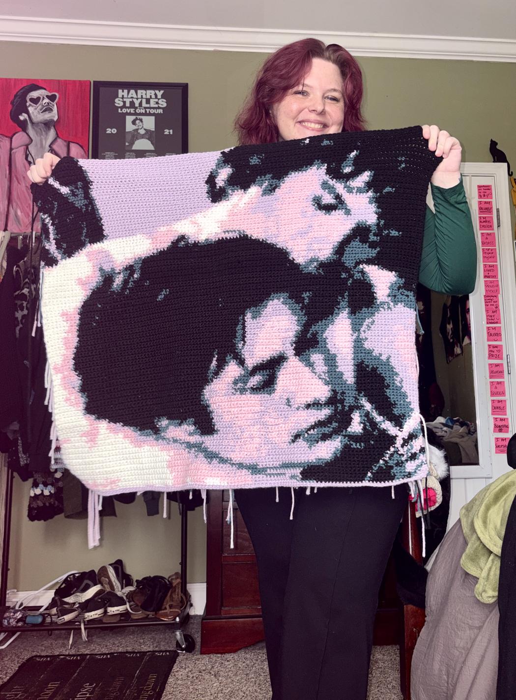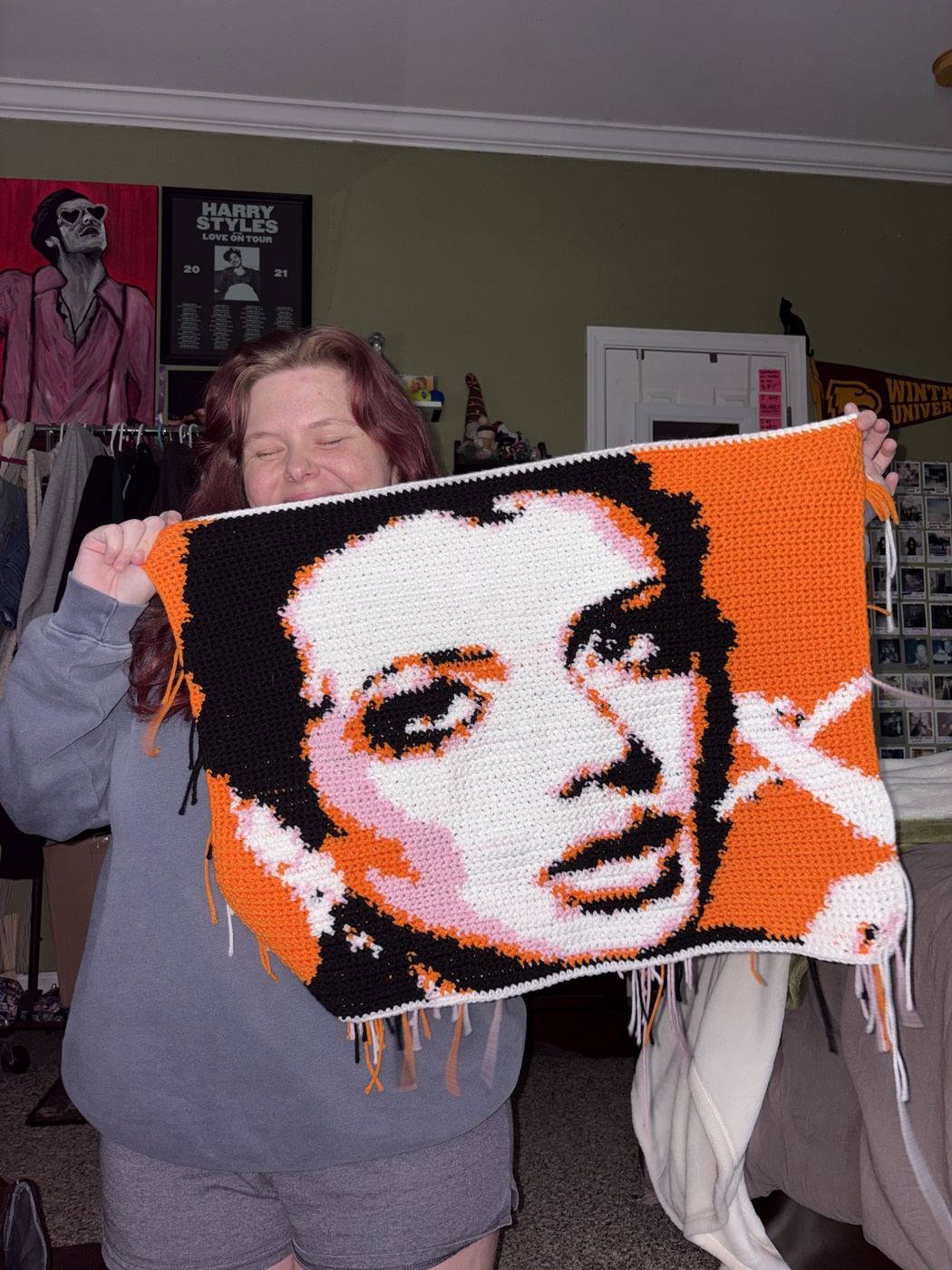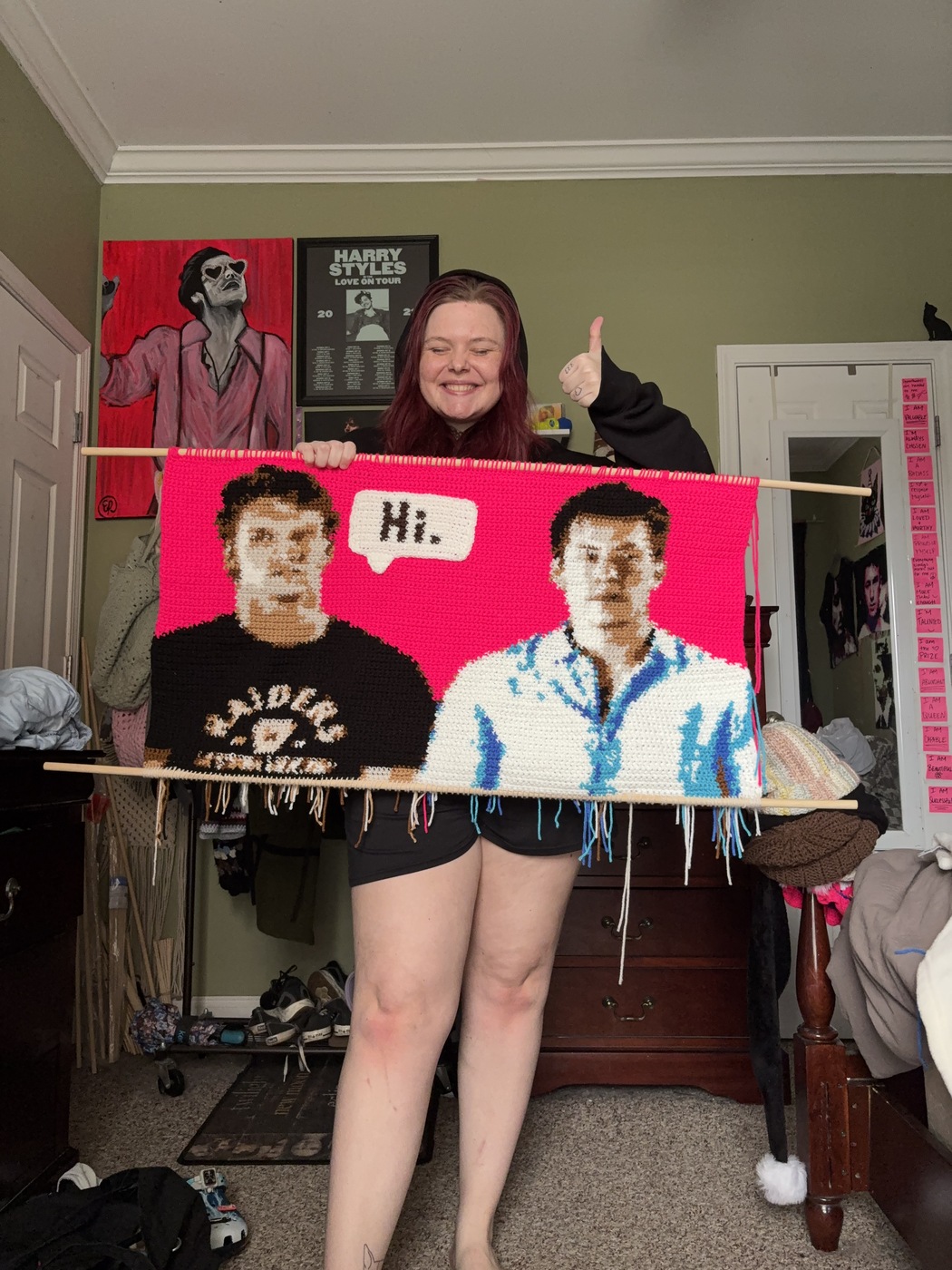 It honestly really depends on the size, subject, and what I think is right for the project. With my Heated Rivalry tapestries, I wanted to make sure they were immediately recognizable. Because Connor Storrie and Hudson Williams have very distinct facial features, especially their lips and eyes, I simply had no choice but to make these big, intricate pieces! It’s kind of the same for my Scream cardigan. Everyone knows Scream and its iconography so I had to make sure there was more than enough detail to make the legendary Drew Barrymore’s face. For my Harry Styles “Kiss All The Time, Disco Occasionally” tapestry, I wanted something simple and almost abstract because the focal point wasn’t really his face. I also made it in a time crunch and didn’t want the project to be too big. That’s why it’s not as detailed as my other pieces. Like I said, it all depends on the project!
