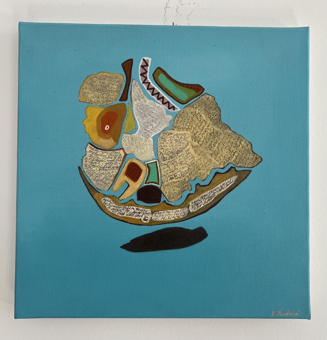 This fascination of using text in paintings started in France. I was influenced by the study of the Middle Ages and especially its illuminated manuscripts during my university studies in Clermont-Ferrand in France in 2002 where I obtained valuable material for my thesis “Depiction of the creation of the world according to the book of Genesis “. I created The Graphic Series “Seven days of creation” by dry-point engrave. And later, when I was writing my doctoral thesis about Lettrism in post-graduate studies Didactics of Visual Art where I was also focused on text and image. Image and text in the interference of French culture on Slovak fine arts of the present. My objective was Comparison and analysis of the artistic direction of Lettrism in French and Slovak painting today for better orientation of students and teachers of art education in the era of multiculturalism.