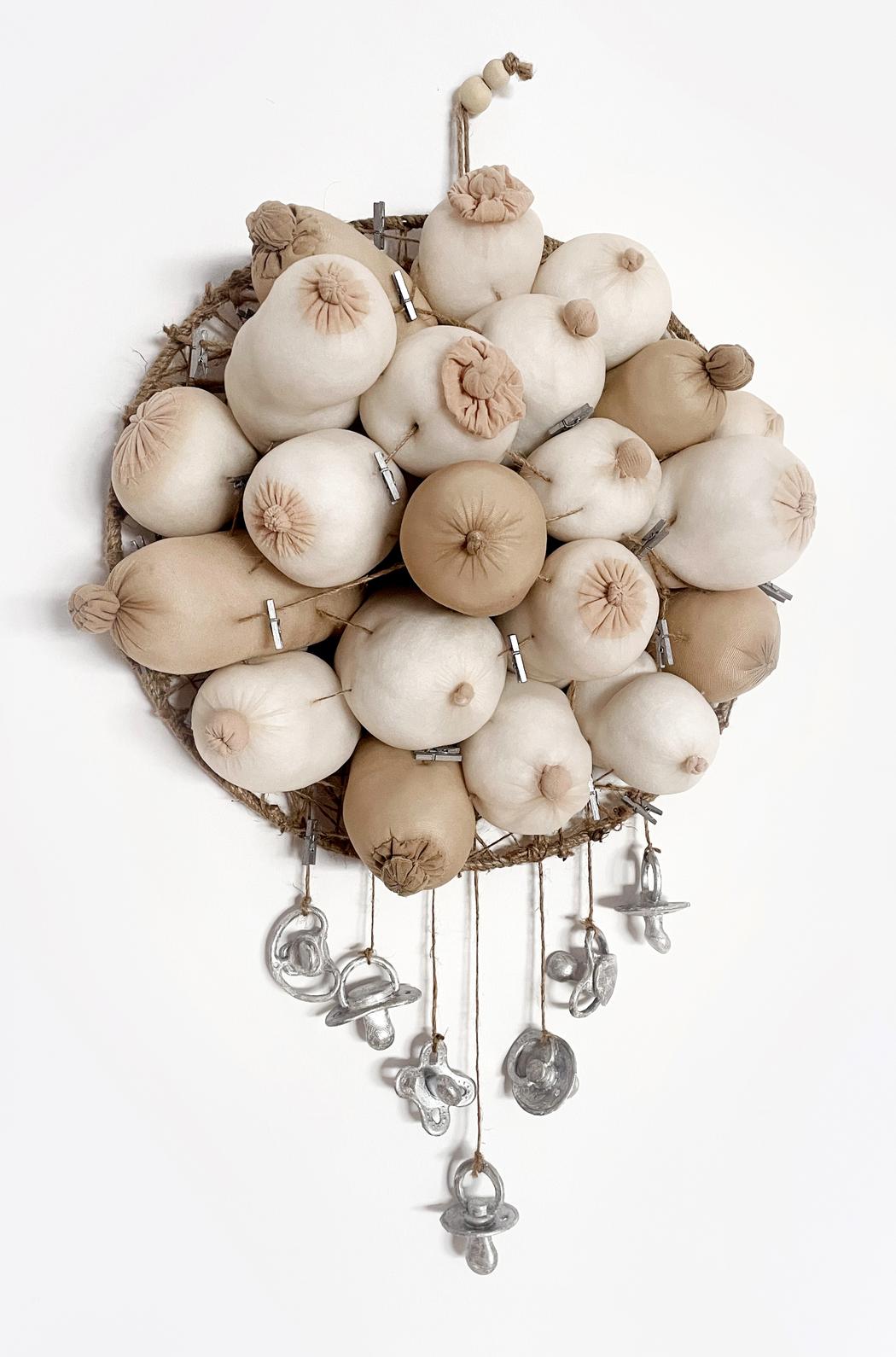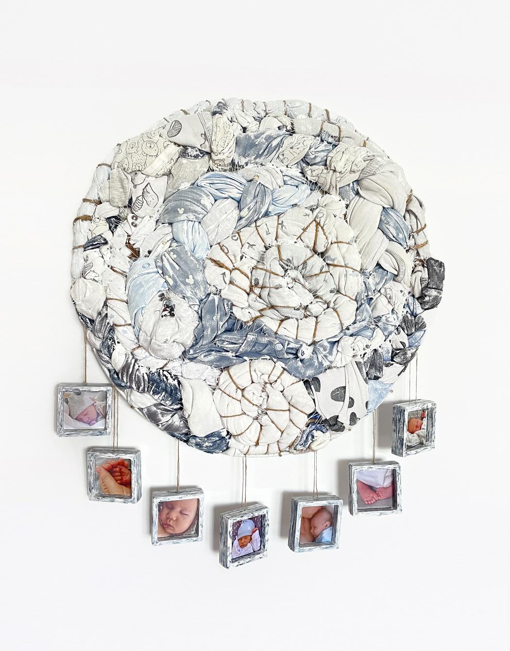 In several pieces you integrate objects associated with care – pacifiers, baby clothes, swaddles. What role do these physical artifacts play in preserving memory and shaping narrative?